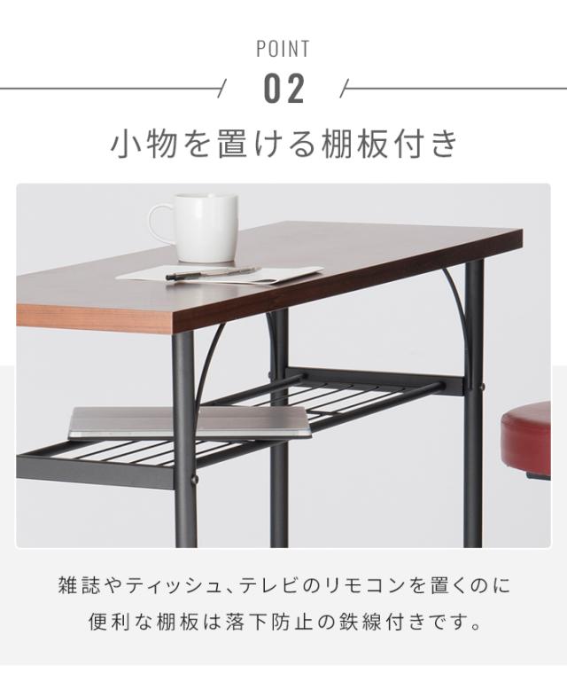 | おうちをカフェやバーのように演出できるカウンターテーブル&チェア2脚セット。 簡易ダイニングや台所周り、飲食店や店舗など様々なシーンで活躍します。 テーブルは幅100cm、奥行35cmのコンパクトな設計で場所を取らずにスタイリッシュに設置できます。 天板は2.5cm厚の突板でウォールナット木目がインテリア性を高めます。 雑誌やティッシュを置くのに便利な棚板は落下防止の鉄線付き。 中央下は揺れ補強兼足置きとして太パイプを通してあります。 足元はガタツキを微調整できるアジャスター付き。 チェアの背もたれはウォールナットの木板を使用し、味のある色味と4つのボタンでおしゃれな印象に。 座面は厚さ6cmの高密度ウレタンフォームで耐久性をアップ。 また、パイプの接続部分は点溶接・スポット溶接ではなく、すべて全溶接でしっかり安定しています。 座から上は360度回転できるので、立ち座りもラクラク。 足元はキャスターのない固定タイプなので、安心して座れます。 |