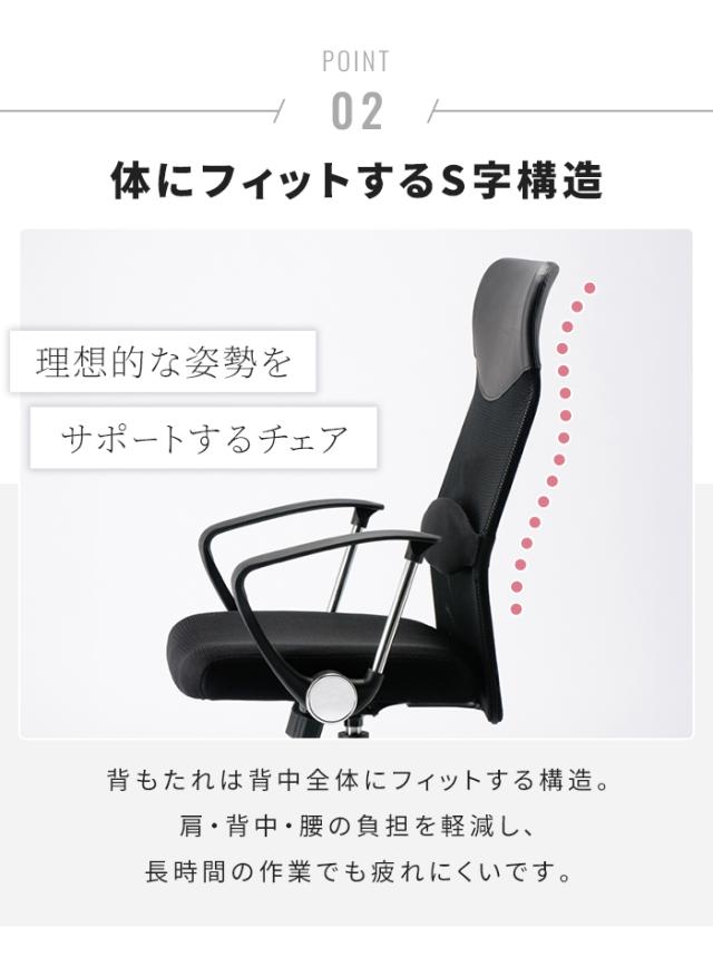 背もたれの滑らかなS字デザインと、お好みの位置に調整できる腰当てランバーサポートによりデスクワークでの体への負担を軽減。