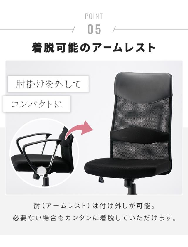 | 頭までしっかりサポートしてくれるハイバック仕様のデスクチェア。 ロッキング機能(最大20度)を使えば体全体を伸ばしてリラックスできます。 背もたれの滑らかなS字デザインと、お好みの位置に調整できる腰当てランバーサポートによりデスクワークでの体への負担を軽減。 メッシュの2層構造で湿気を逃し、蒸れずにサラサラ、弾力性・安定感・サポート力が違います。 座面には高密度ウレタンに加え、チップウレタンを追加し、抜群の耐久性と座り心地を実現。 座面下のレバーで簡単にお好みの高さに調整できます。 高級感のあるメッキ脚にキャスターがついており、360度回転し、座ったまま移動もラクラク。 肘(アームレスト)は付け外しが可能可能です。 |