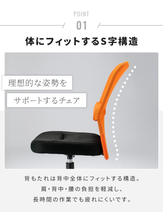 背もたれのS字構造と、お好みの位置に調整できる腰当てランバーサポートによりデスクワークでの体への負担を軽減します。