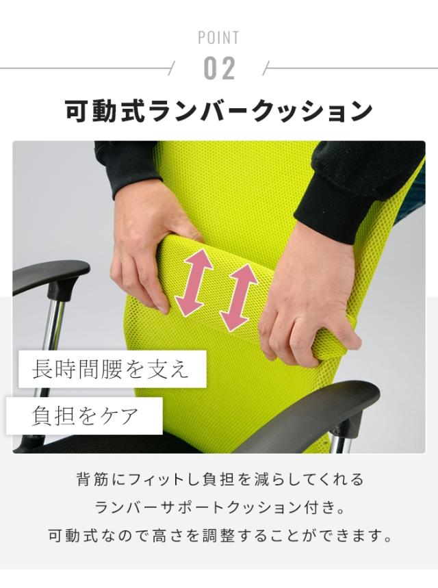 背もたれのS字構造と、お好みの位置に調整できる腰当てランバーサポートによりデスクワークでの体への負担を軽減します。