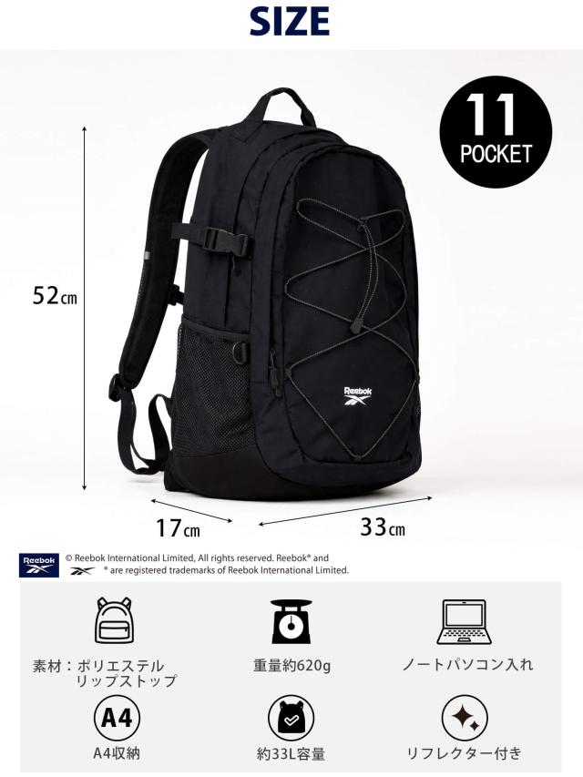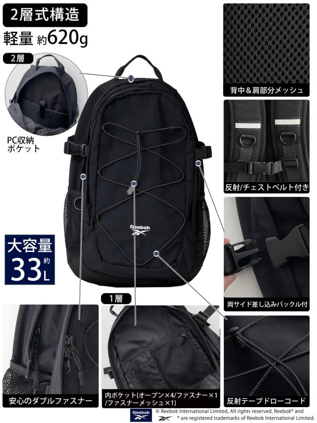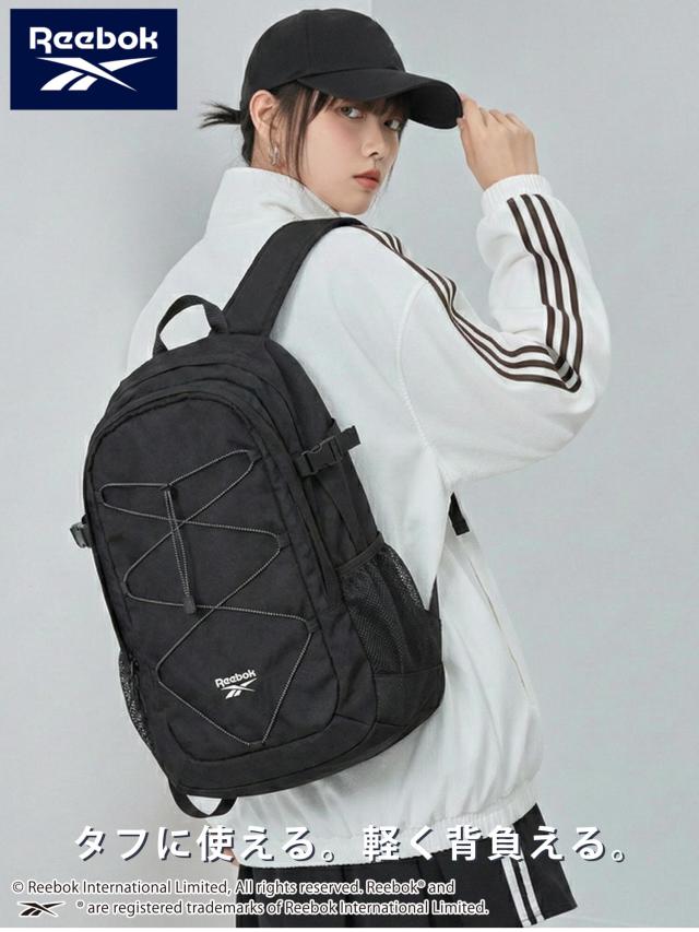 ・通勤・通学におすすめ 教科書やノート、ファイル類をまとめて収納できるサイズ感で、学生の毎日の通学に最適。 背面とショルダーベルトにはクッション材を内蔵しており、荷物が多い日でも肩や背中への負担を軽減します。 制服・私服どちらにも合わせやすいシンプルなデザインも魅力です。 ・旅行 軽量ながら約30Lと収納力があり、衣類や小物をまとめて持ち運びやすいバックパック。 2ROOM&詳細ポケットも多数ついており、沢山の荷物もきれいに整理整頓可能◎ ダブルファスナー仕様で荷物の出し入れがスムーズなため、移動の多い旅行シーンでもストレスなく使えます。 ・アウトドア 撥水加工や引き裂きに強いポリエステルリップストップ素材を使用しているため、アウトドアシーンでも安心。 サイドポケットや外付けコードを活用して、タオルや小物類を分けて収納できます。 視認性を高めるリフレクター付きで、夕方以降の使用にも配慮した設計です。 ・スポーツやフィットネス ジムや部活用のバッグとしても使いやすく、ウェアや小物などをまとめて収納可能。 チェストベルト付きで背負った際の安定感があり、移動中もバッグがブレにくいのがポイントです。 Reebokらしいスポーティなデザインは、アクティブなシーンにもピッタリ。 |