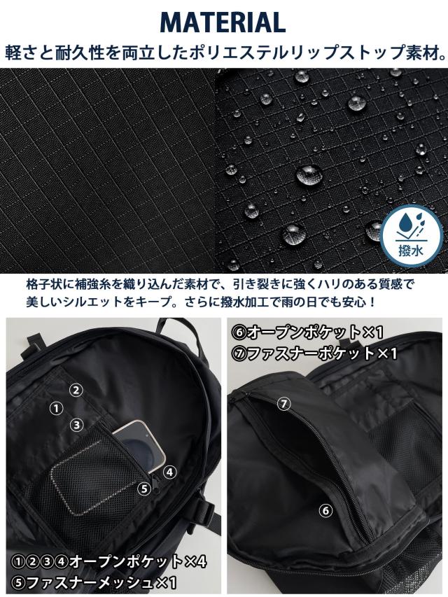 ・側面サイドポケット×2:水筒や折りたたみ傘の収納に便利。 ・内側オーガナイザーポケット×1:鍵やペンなどの小物の整理に。 ・内側PCポケット×1:15インチまでのノートパソコンを安全に収納可能です。 |