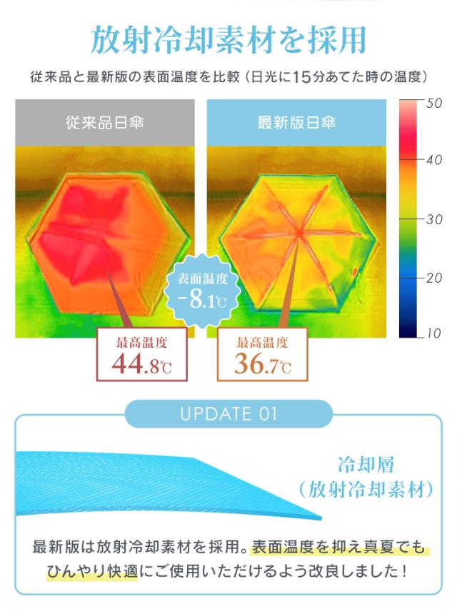 ・UVカット率100% / 遮光率100% / UPF50+ ・ひんやり放射冷却生地 ・遮熱効果で強い日差しをブロック ・晴雨兼用タイプ(撥水仕様) ・裏地ブラックコーティング ・コンパクトサイズで持ち運び便利 ・錆びにくい露先仕様 ・手になじむマット加工の持ち手 |