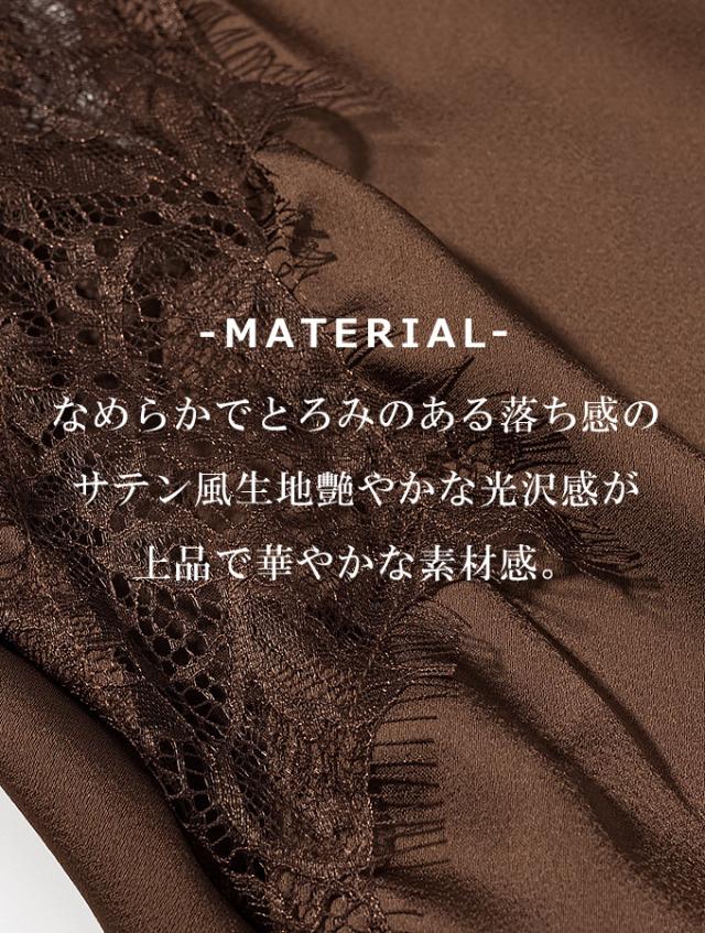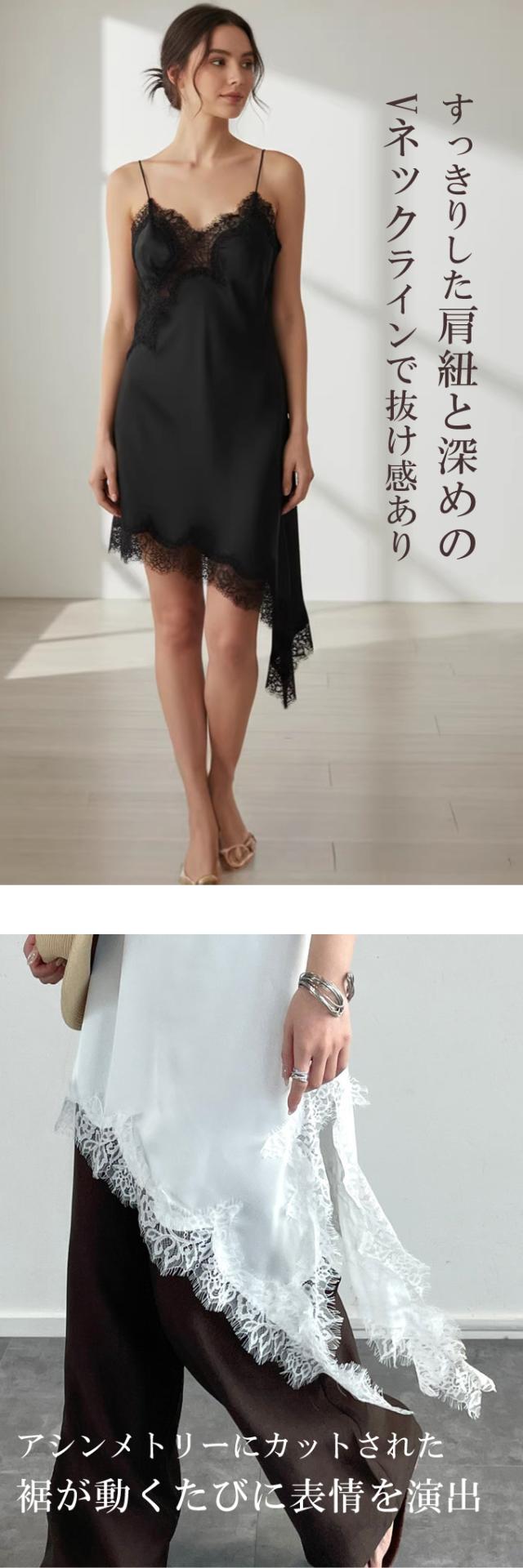 艶やかなサテンと繊細なレースが目を引くアシンメトリーデザインのキャミワンピース。