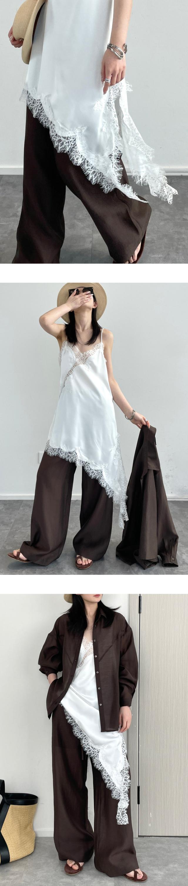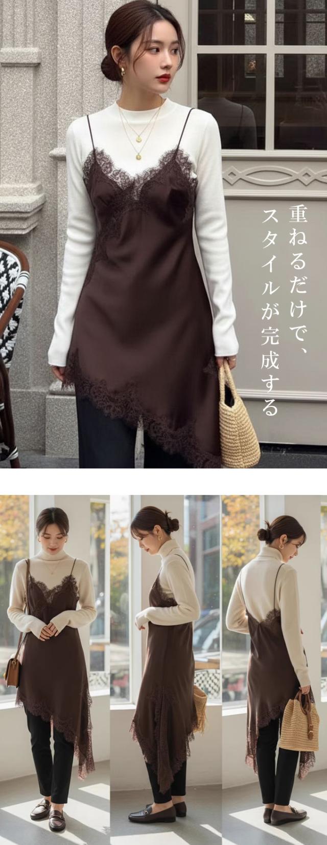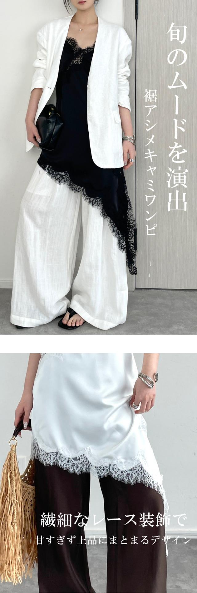 レース キャミソール ワンピース アシンメトリー 重ね着 レイヤード 肩紐長さ調整可 アジャスター付き 魅せレース 華やか トレンド レディース おすすめ おしゃれ 着回し おしゃれ お出かけ