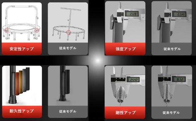 高密度(6重)の縫製で非常に丈夫なトランポリン面!強化スプリングで静音性を高め、飛び跳ねる時の音を最小限に抑えます♪脚部分には衝撃吸収スペーサーと消音ゴムキャップを装備し、接地面の保護と衝撃吸収を実現!