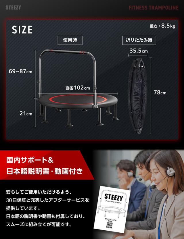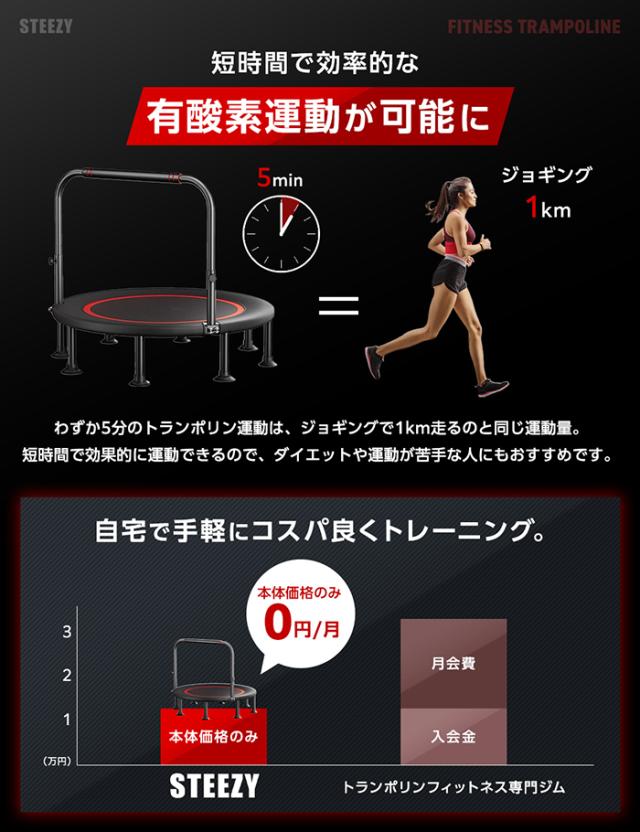 たった5分のトランポリン運動で1kmのジョギングと同じ運動量を実現!ダイエット中の方や運動が苦手な方にも最適!上下運動で血液やリンパの流れが良くなり、むくみ解消や体脂肪燃焼を促進。また体幹が鍛えられ💡姿勢改善や腰痛予防にも効果的です!雨の日でも室内で効率的に運動ができます♪
