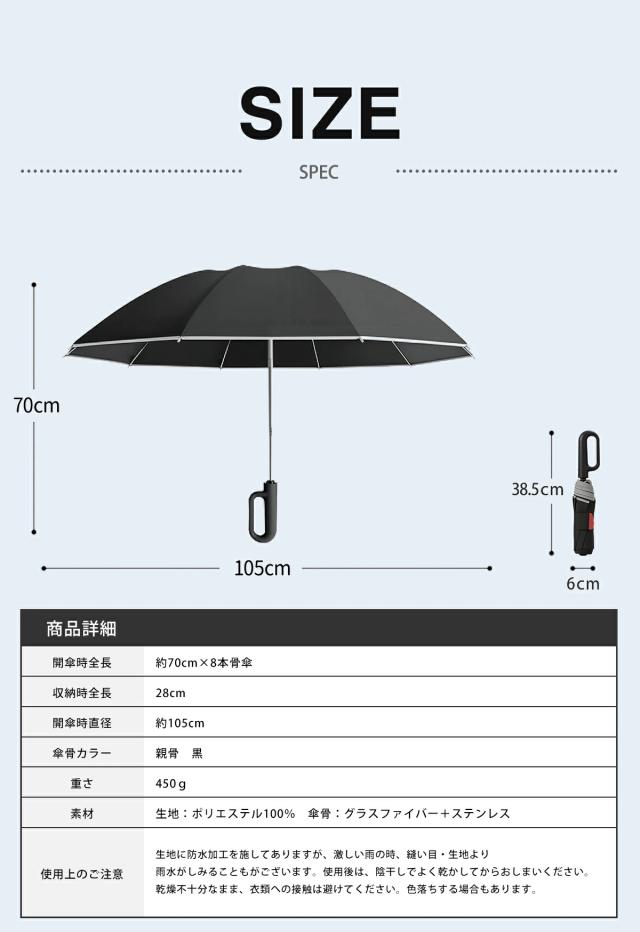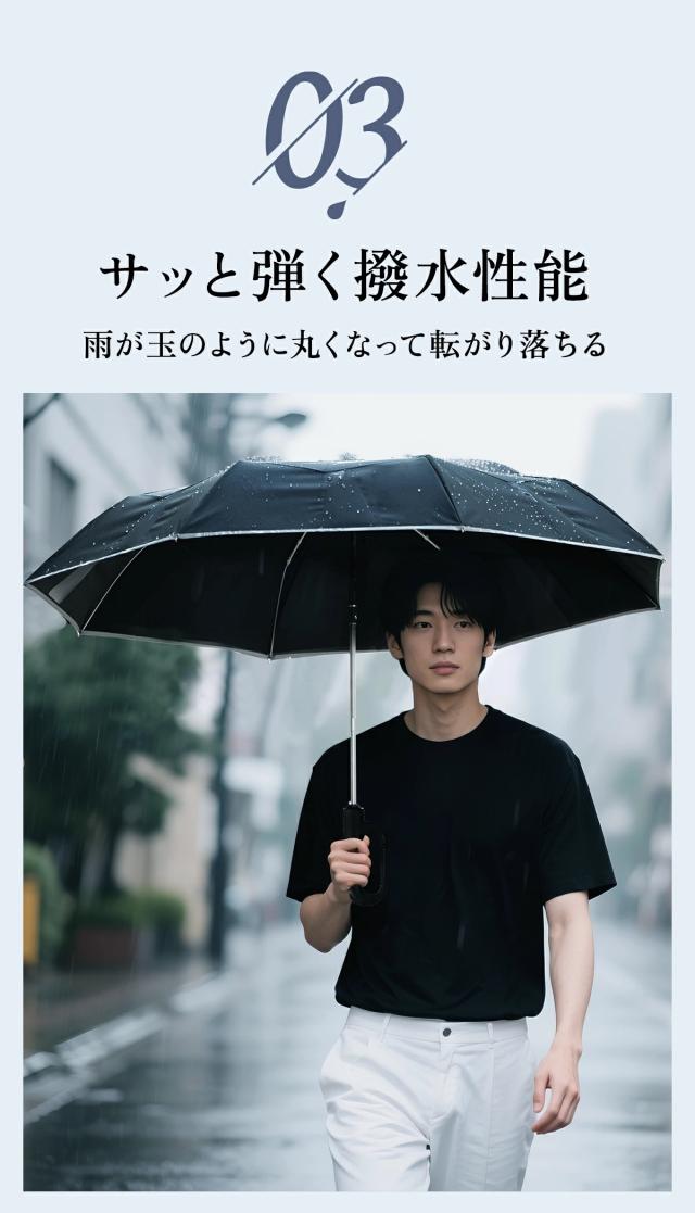 超撥水加工で水滴を弾き、軽く振るだけで傘が乾く。夜道でも安心な反射ストリップ付きで、安全性にも配慮。通勤・通学・父の日の贈り物にもおすすめ!