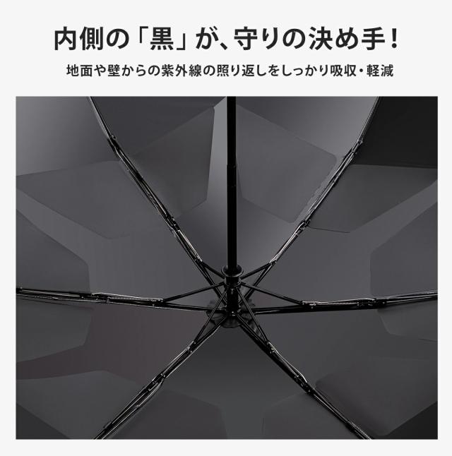 開いた直径約108cmの大判サイズで、男性の使用にも最適な広さ。黒無地のシンプルデザインで、メンズにもレディースにもマッチする男女兼用仕様。
