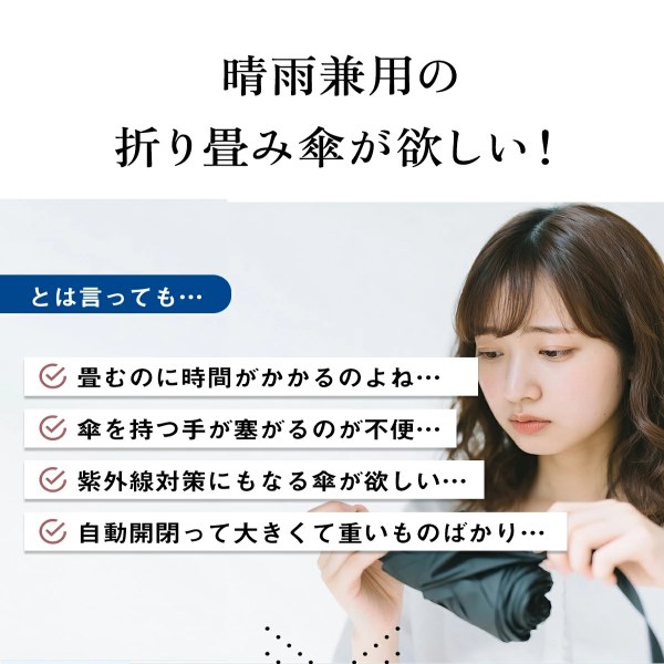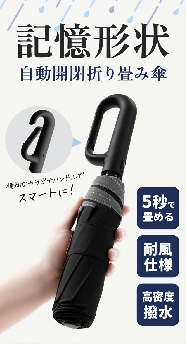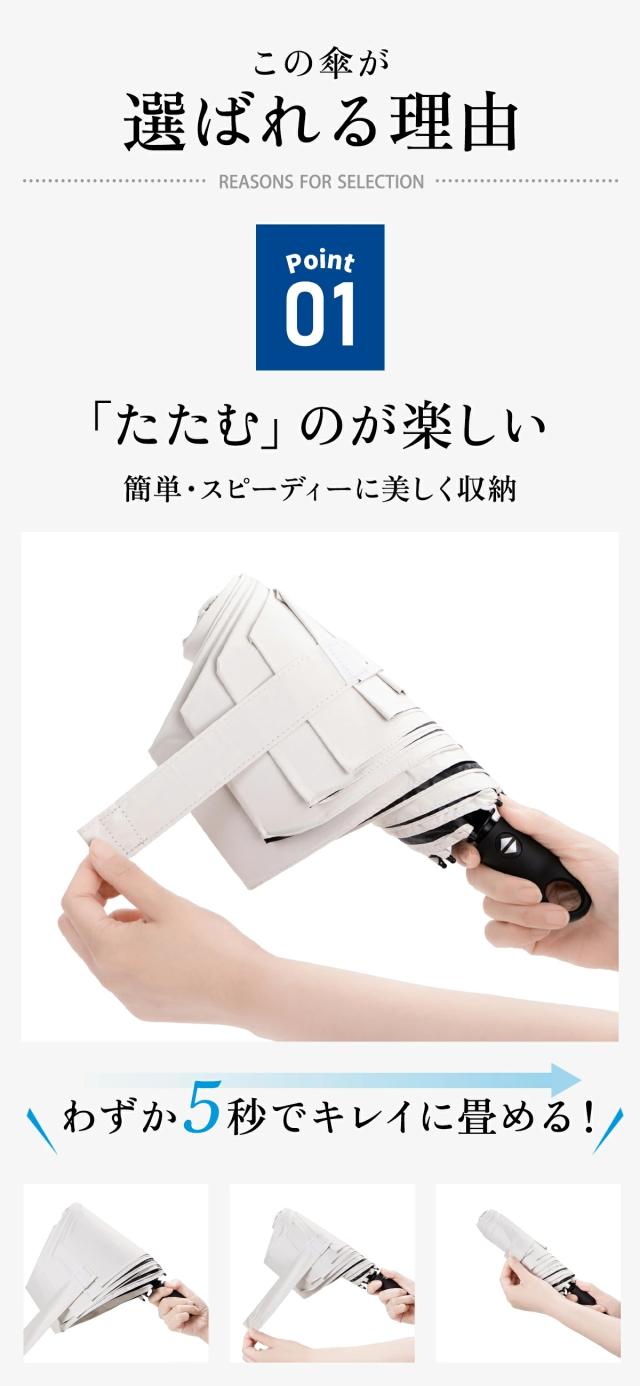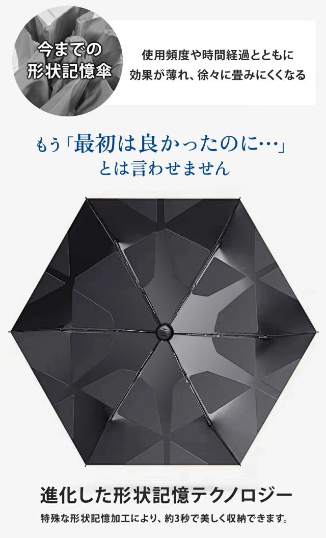 次世代の形状記憶構造で、面倒な折り畳みをわずか3秒で完了。形状安定だから、忙しい朝や外出先でもスマートに収納。梅雨や急な雨でも頼れる一品。