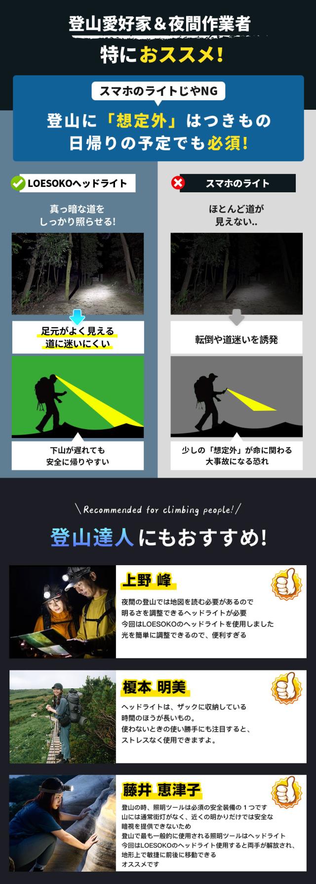山道・テント設営・釣り場でも視界をしっかり確保。