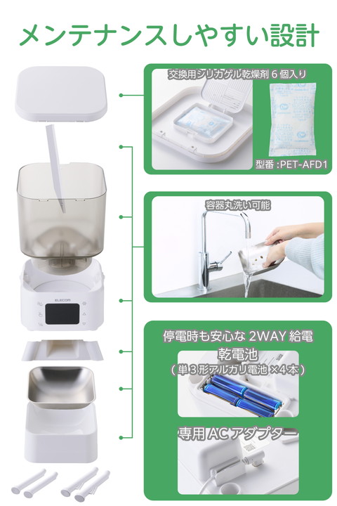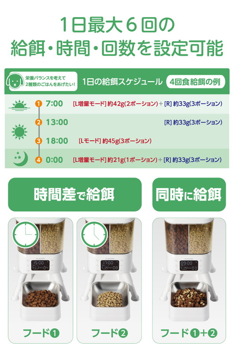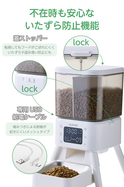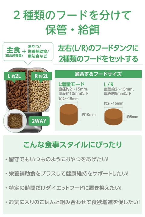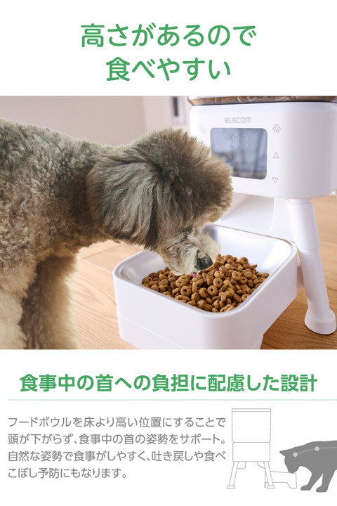 お留守番のときも、うちの子に合わせた食事管理を。2種類のフードを左右独立のタンクで分けて保管し、いつもの食事スタイルであげられるタイマー式自動給餌器です。普段のごはんやおやつ、栄養補助食を時間差や量など細かく給餌を設定できるので、健康管理やちょっとしたご褒美にもぴったり。ボウル位置を高めに設計し、食事中の姿勢や吐き戻しの予防もサポートします。![]() ■2種類のフードを左右独立のタンクで分けて保管し、いつもの食事スタイルで与えられるタイマー式自動給餌器です。お留守番のときも、うちの子に合わせたいつもの食事スタイルで与えられて、健康管理をサポートします。 ■1日最大6回の給餌可能。給餌時間・回数はタイマーで設定できます。 ■1回あたり1〜12ポーションまで給餌量を選択できます。左右のタンクそれぞれに時間・量・回数を細かく設定できるので、おやつや栄養補助食を加えるなど、普段通りの食事管理が可能です。 ■※1ポーションは右給餌(R):約11±3g、左給餌(L):約15±3g、左増量給餌(L増量モード):約21±3gです。 ■※ドライフード専用です。半生・セミモイストタイプ・缶詰などのウェットタイプのフードや、形状にばらつきのあるおやつは使用できません。 ■左側のタンクに左増量給餌(L増量モード)を搭載し、直径2mm〜15mm・厚み10mm以下の大きめフードも給餌可能。大型犬や食べ応えを重視したいときにぴったりです。 ■※給餌タンクを設定する際、左増量給餌(L増量モード)と左給餌(L)は、組み合わせて設定することはできません。 ■フードボウルを床から高い位置に配置し、食事中の首や姿勢をサポート。自然な姿勢でごはんを食べられるので、吐き戻しや食べこぼしの予防にも役立ちます。 ■左右のフードタンクを合わせて、約4Lの大容量をストック可能。旅行や出張などで不在が続くときでも、ごはんをたっぷりストックしておけます。 ■半透明のフードタンクで残量を一目でチェックできます。 ■フードボウルは汚れ・傷がつきにくいステンレス製で、いつでも清潔を保てます。 ■専用ACアダプターと乾電池(単3形アルカリ電池×4本)の両方で給電できます。併用することで、停電発生時や万が一コードが抜けてしまった場合も、時刻通りに給餌できます。 ■※乾電池は非常用の予備電源となります。通常時は乾電池が入っていても、必ず付属の専用ACアダプターをご使用ください。 ■AC電源からの給電が停止しても、乾電池を補助電源としてセットしておくと設定済みの現在時刻・給餌設定が保持され、再設定の必要がありません。 ■※乾電池をセットしていない場合は、現在時刻がリセットされます。 ■※乾電池は付属していません。別途ご用意ください。 ■フードタンク蓋裏の乾燥剤ポケットに乾燥剤をセットできます。ドライフードを湿気から守って、いつでもカリカリをキープします。 ■※交換用シリカゲル乾燥剤6個入り(型番:PET-AFD1)が使用できます。 ■フードが詰まった際はインジケーターランプが点滅し、フード詰まりアイコンが表示されます。電池残量が低下すると、電池アイコンが点滅して交換時期をお知らせします。 ■万が一倒れてもフードがこぼれにくい蓋ストッパー付き。ワンちゃん・ネコちゃんのいたずらや盗み食い防止にもなります。 ■給電ケーブルはメッシュタイプを採用。ケーブルの外部被覆(シース)はナイロン製で、噛みつきやいたずらによる断線が起きにくい構造です。 ■1日6回、1回あたり左給餌(L)と右給餌(R)を各6ポーションずつ給餌しても、電気代はひと月たったの約4円。うれしい省エネ性能です。 ■※1kWh:31円で計算しています。 ■※こちらの電力量料金はあくまで目安です。詳細な電力料金単価は、ご契約の電力会社にお問い合わせください。 ■自社環境認定基準を1つ以上満たし、『THINK ECOLOGY』マークを表示した製品です。 ■環境への負荷軽減のため、輸送効率を高める設計の外装箱を使用した製品です。 ![]() ■定格電圧:DC5V(USB給電入力) ■消費電力:作動時:約1W、待機時:約0.2W ■電源:AC100〜240V DC5V/1A、または非常用予備電源として単3形アルカリ電池×4本(別売) ※マンガン電池、充電式電池のご使用はお避けください。 ■コネクター形状:USB Type-C(TM)ポート ■フードタイプ:ドライフード専用 ■フードボウル:1個(1匹用) ■最大容量(重量):総タンク容量:約4L/約2.2kg、左側:約2L/約1.1kg、右側:約2L/約1.1kg ※重量は目安です。フードの形状や密度、保存環境などにより変動します。 ■材質:本体・フードタンク・蓋・トレイ:ABS、フードボウル:ステンレス ■サイズ:幅約230mm×奥行約207mm×高さ約364mm(フードボウル含まず)、幅約230mm×奥行約312mm×高さ約364mm(フードボウル取り付け時) ■質量:約1.3kg(フードボウル、専用ACアダプター、専用USB給電ケーブル、乾燥剤含まず) ■セット内容:専用ACアダプター(入力:AC100V〜240V、出力:DC5V/1A)、専用USB給電ケーブル(約1.5m ※コネクター含まず)、乾燥剤 ■カラー:ホワイト ■使用温度・湿度:約5℃〜40