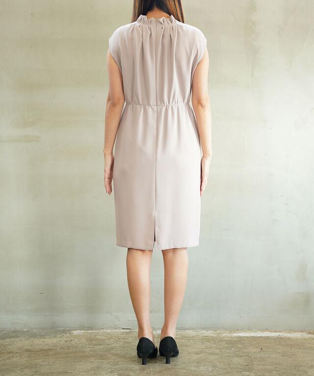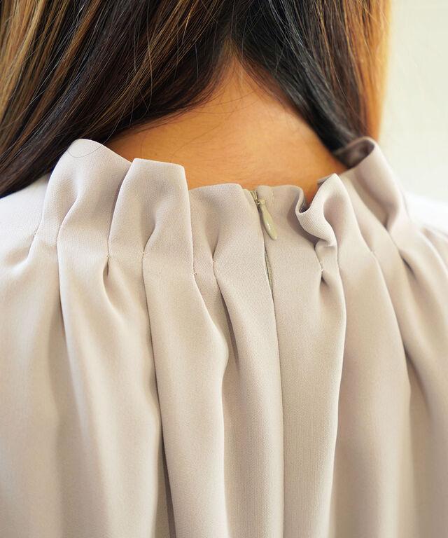 ネックに寄せたギャザーが、気になりがちなデコルテラインを優しくカバー。