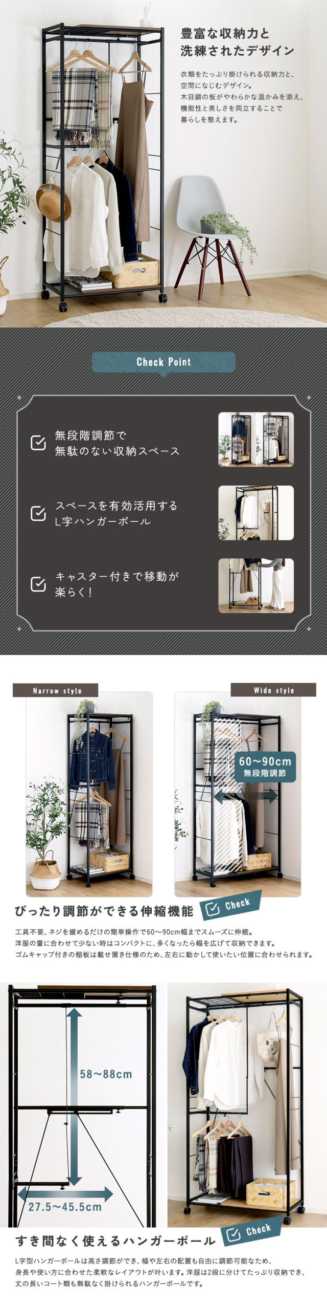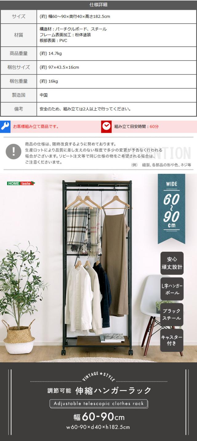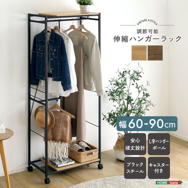 ロングもショートも 伸縮 ハンガーラック 幅60〜90 【送料無料】 アイアン 2段 天板付き キャスター付き 黒 ブラック ヴィンテージ 頑丈 おしゃれ スリム 棚付き スチール