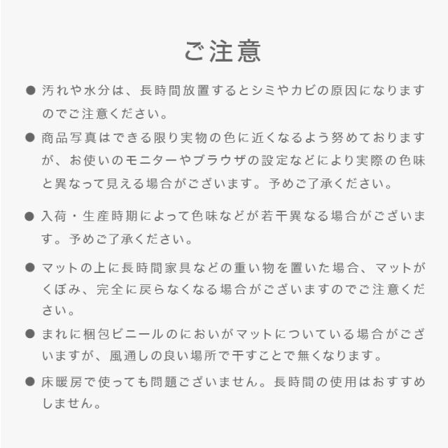 ・商品写真はできる限り現物の色に近くなるよう努めておりますが、お使いのモニターやブラウザの設定などにより実際の色味と異なって見える場合がございます。 ・入荷、生産時期によって色味などが若干異なる場合がございます。 ・マットの上に長時間家具などの重い物を置いた場合、マットがくぼみ、完全に戻らなくなる場合がございますのでご注意ください。 ・まれに梱包ビニールのにおいがマットについている場合がございますが、風通しの良い場所で干すことでなくなります。 ・床暖房で使用しても問題ございません。長時間のご使用はおすすめしません。 ・商品を使用して発生した事故・トラブル・破損等につきましては一切の責任を負いかねます。 ・必ず保護者のもとでご使用し、お子様の行動には十分ご注意ください。 ・商品は、モニターによって色合いが異なって見える場合があります。 ・仕様・デザインは改良のため予告なく変更することがあります。 |