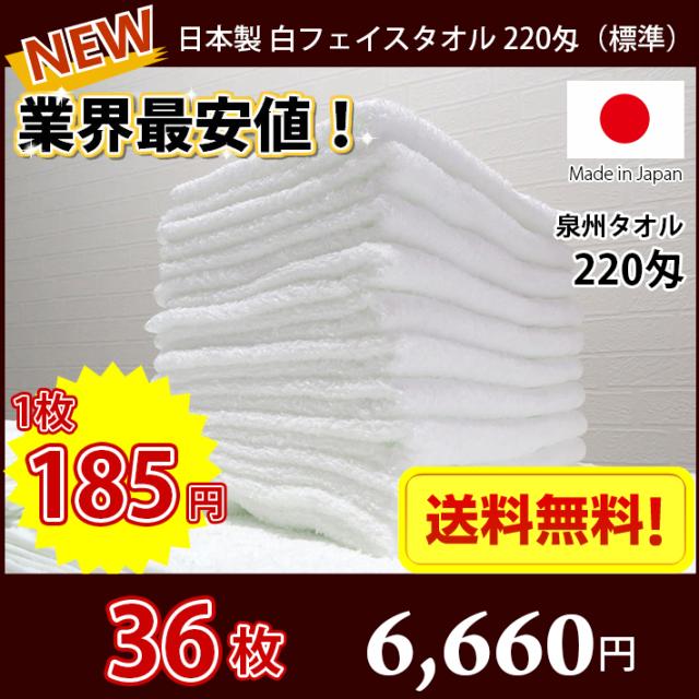 【送料無料】業界最安値! 36枚セット 〜 日本製 泉州 白タオル 標準 220匁 / タオル 普通のタオル 白いタオル 業務用タオル フェイス 白 ホワイト 業務用 理髪店 掃除 雑巾 まとめ買い 国産