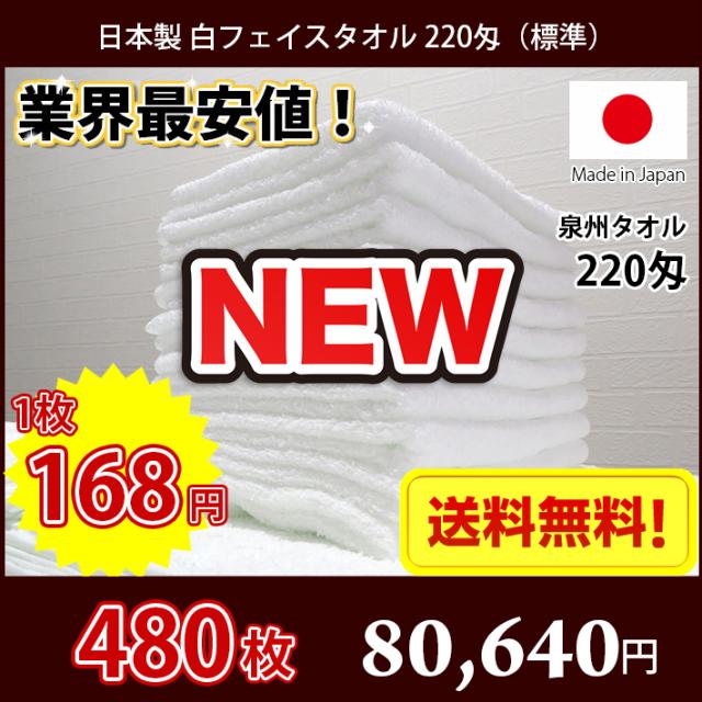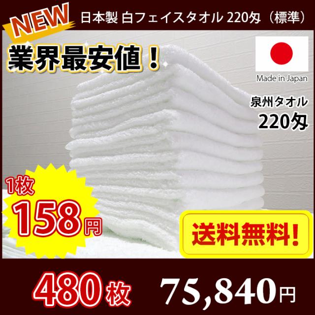 【送料無料】業界最安値! 480枚セット 〜 日本製 泉州 白タオル 標準 220匁 / タオル 普通のタオル 白いタオル 業務用タオル フェイス 白 ホワイト 業務用 理髪店 掃除 雑巾 まとめ買い 国産