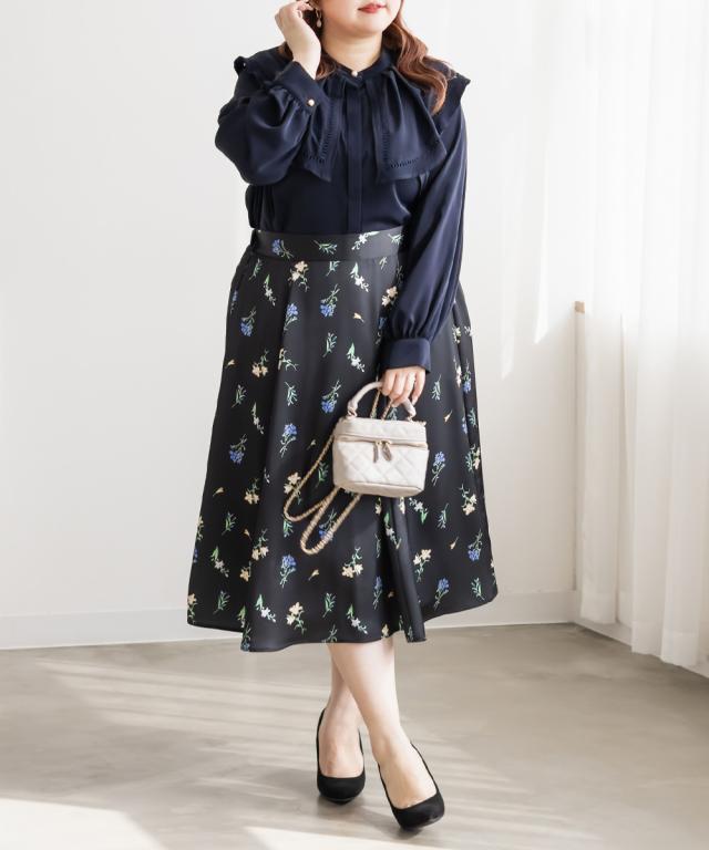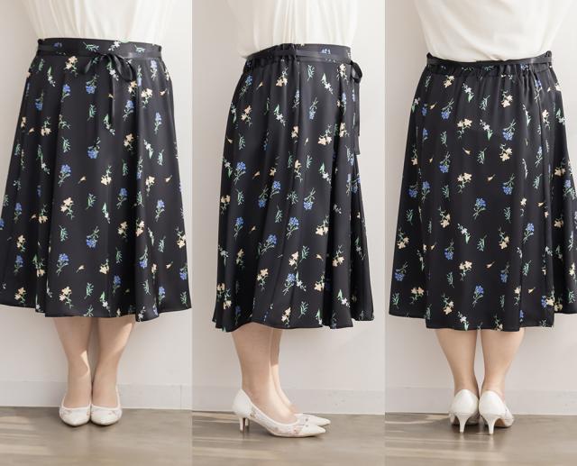 | 3Lサイズを着用しました。いつも選んでいるサイズ感でちょうどよく、ウエストまわりも窮屈感なく安心して穿けました。落ち感のきれいなサテン素材に花柄が映えて、動くたびにふんわり揺れるフレアシルエットがとても女性らしいです。腰やヒップラインを拾いにくく、自然に体型カバーできるのも嬉しいポイント!シンプルなニットやブラウスを合わせるだけでコーデが華やかになるので、デイリーはもちろんお仕事やデートにもぴったりです◎ 軽やかな穿き心地でロングシーズン活躍してくれそうな1枚だと思いました♪ |