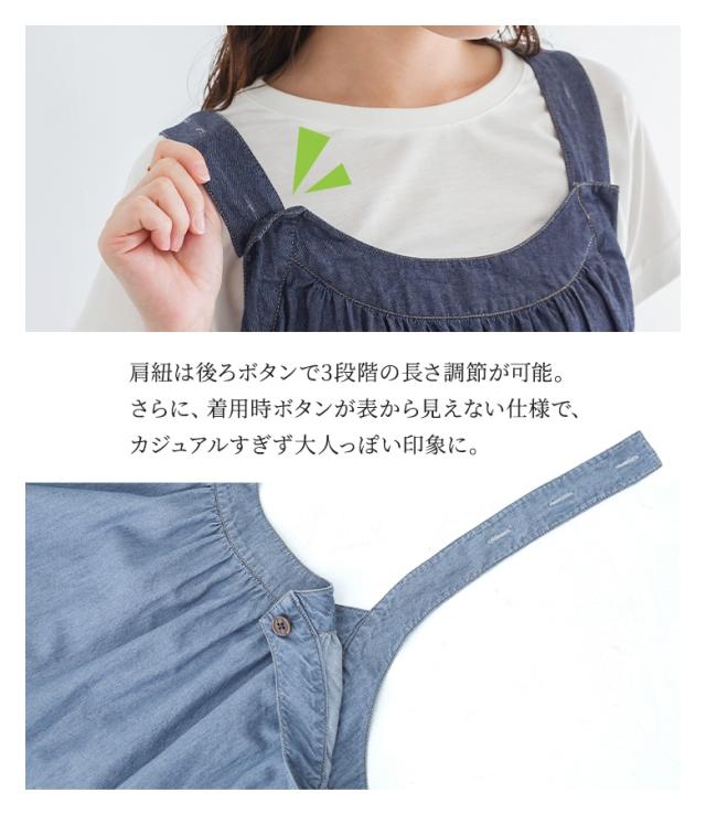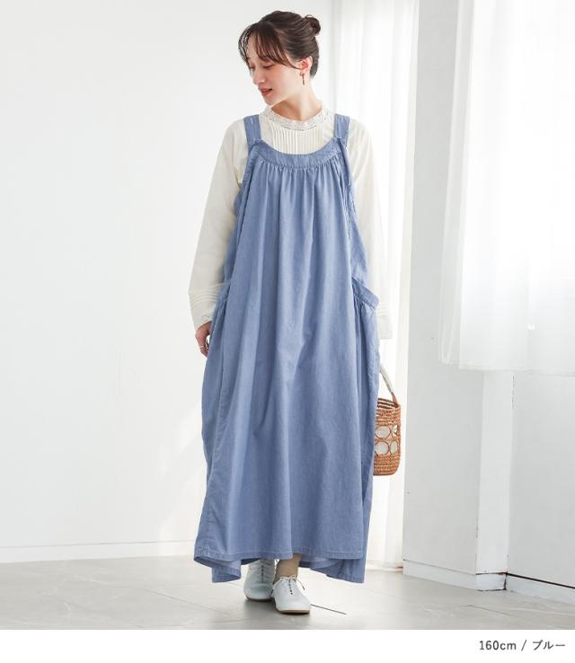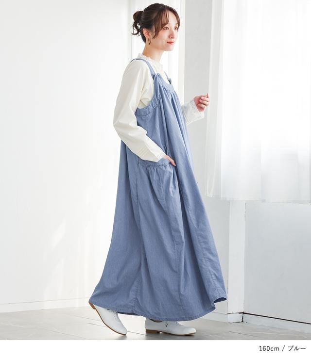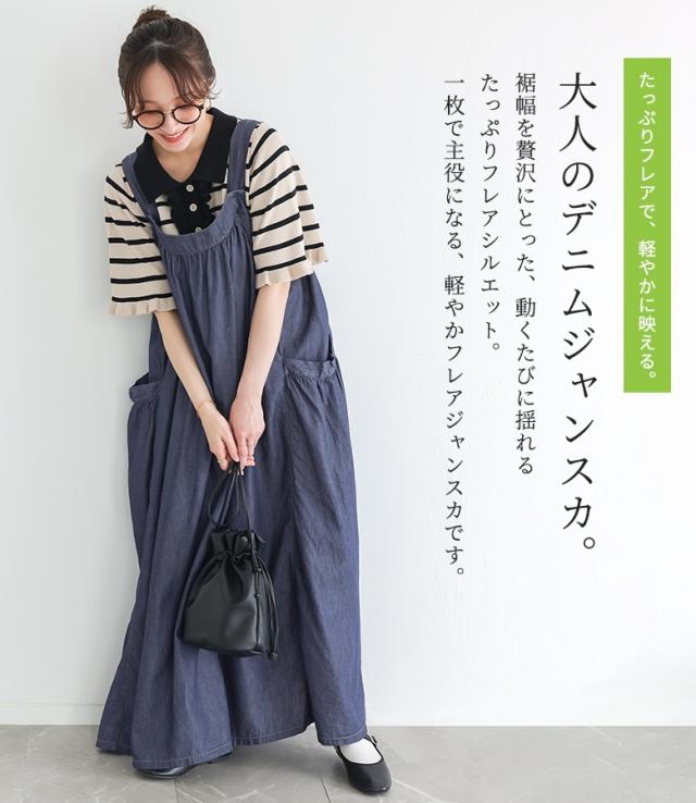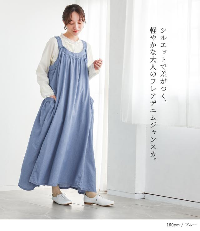 <春新作>『たっぷりフレアデニムジャンスカ』【メール便不可】【30】[ジャンスカ デニム レディース ワンピース ロング丈 ジャンパースカート サロペットスカート 綿100% フレア 調節可能 薄手 春 夏]