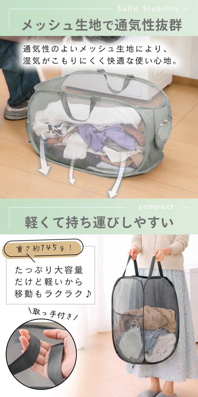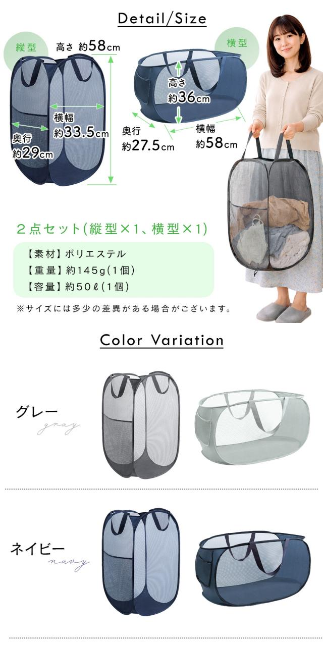 折りたたみ/洗濯かご/籠/カゴ/ランドリーバッグ/2点セット/縦/横/自立式/メッシュ/通気性/軽量/コンパクト/洗面所/大容量/省スペース/スリム/すき間収納/ゴム留め/衣類/タオル/シーツ/一時置き場/取っ手付き/安定/やわらか素材/ポケット付き/脱衣所/コインランドリー/おもちゃ/リビング/玄関/整頓/50L/持ち運び/畳める/速乾/軽い/たためる/洗濯物入れ/衣類収納/