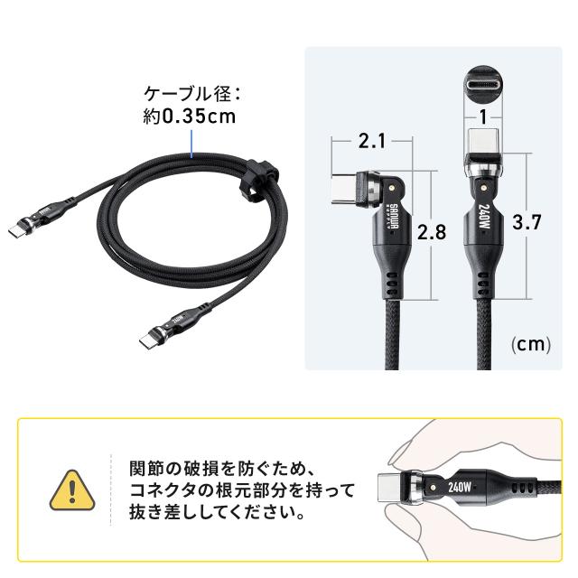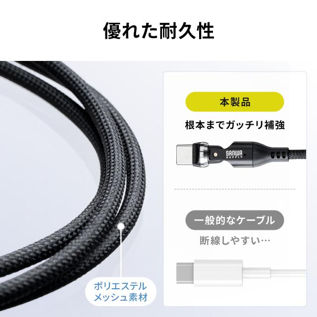 ●両側のコネクタが540度(左右180度+水平360度)回転するケーブルです。●特殊な設計でType-C端子がケーブルと一体化しており、540度(左右180度+水平360度)の回転を実現しています。