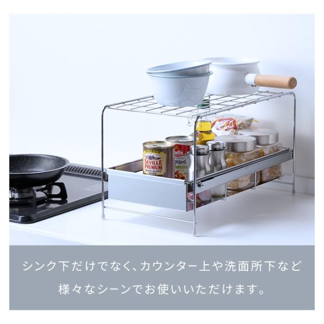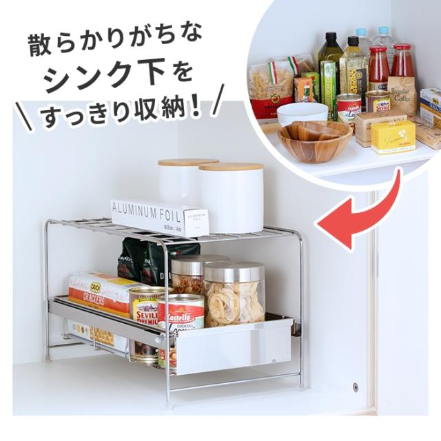 シンク下の空いたスペースを有効活用できる、引き出し付き収納ラック。