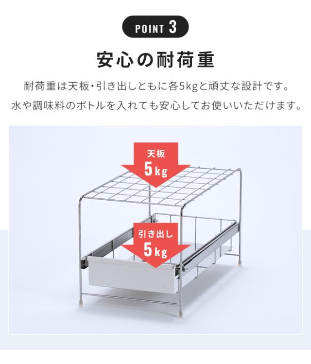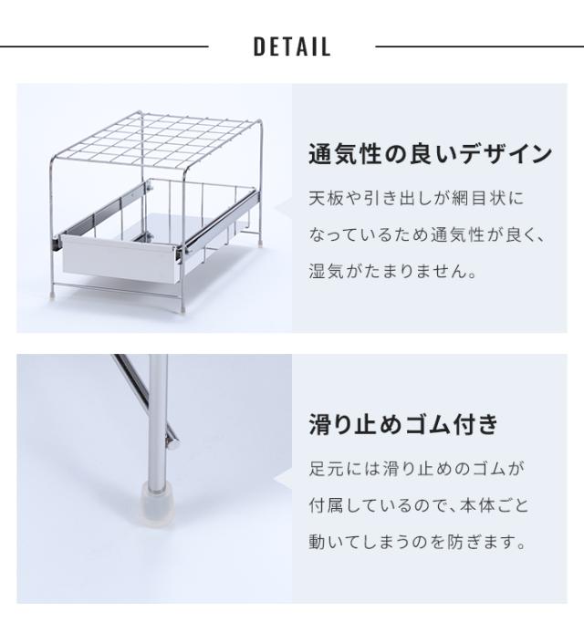 | シンク下の空いたスペースを有効活用できる、引き出し付き収納ラック。 デッドスペースを便利な収納空間に変え、キッチン周りをすっきり整理整頓できます。 手前にスライドする引き出しは奥までしっかり収納でき、奥のアイテムを取り出すときにも便利。 引き出しにはストッパーが付いているので、最大まで引き出しても抜け落ちる心配がありません。 レールにコロが付いているため、重い物を入れてもスムーズに出し入れできます。 天板と引き出しは通気性の良いメッシュ仕様で湿気がこもりにくく、水回りでも快適に使用できます。 光沢が美しいステンレス製でサビにくく、さっとふき取るだけでお手入れ簡単。 引出と中の敷板は外して洗うことができるので、清潔にお使いいただけます。 届いたらすぐに使える完成品でお届け。 |