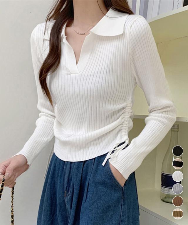 ポロ襟デザインが首まわりをすっきりと見せるリブニットトップス。
