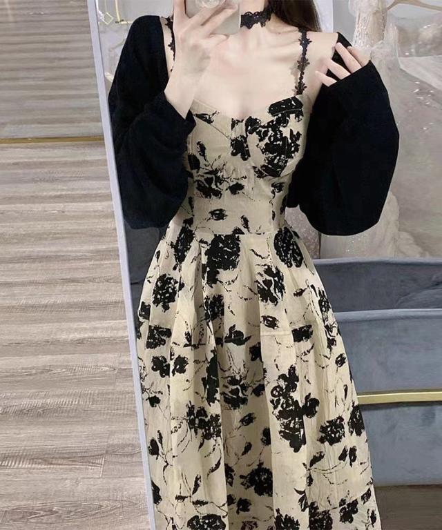 花柄のキャミワンピースと黒のカーディガンのセットアップ