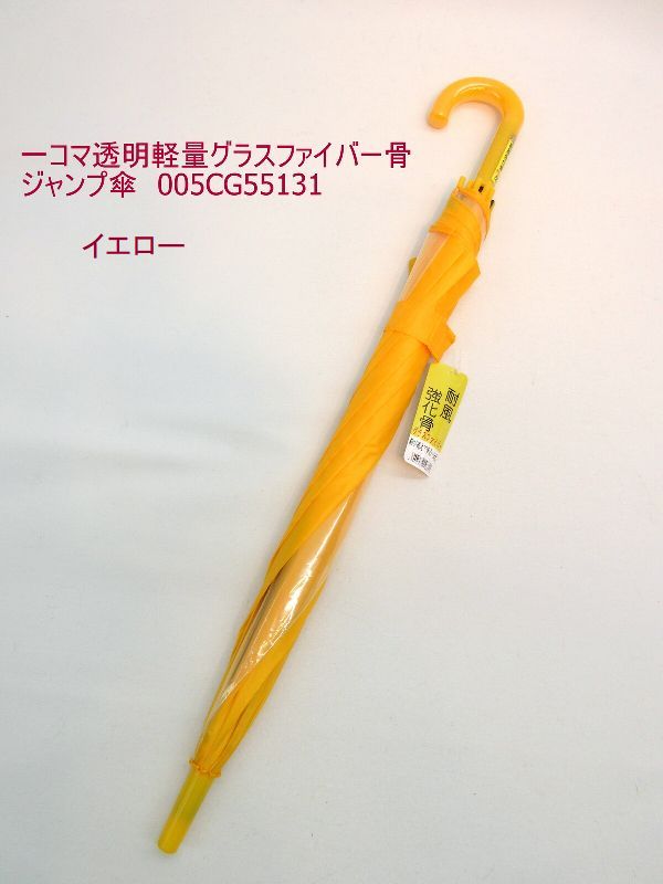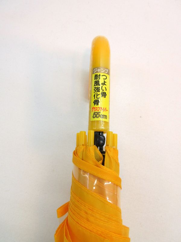 | 黄色無地の子供用ジャンプ雨傘です。 小学校高学年程度の大判サイズです。親骨は曲がっても折れにくいグラスファイバー骨使用・軽くて丈夫なジャンプ無地傘です。 1駒透明部分が入り、前方視界良好。 入園、入学、新学期 |