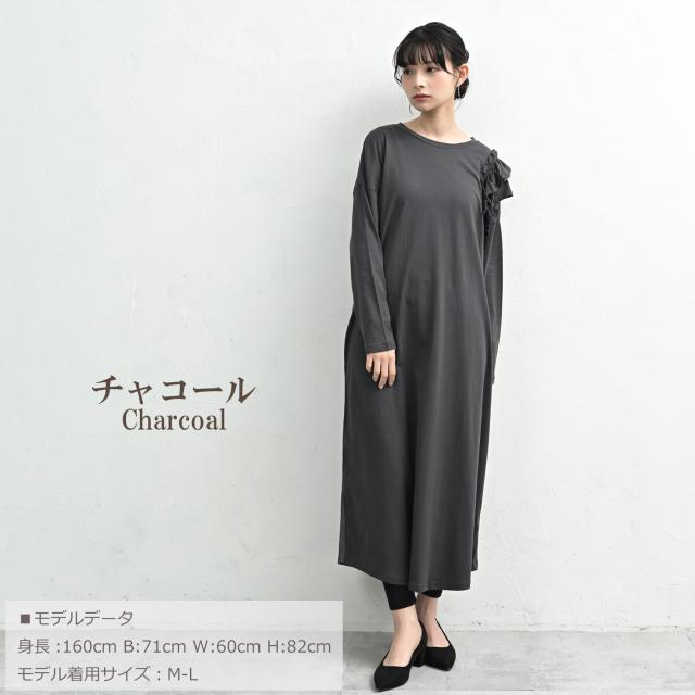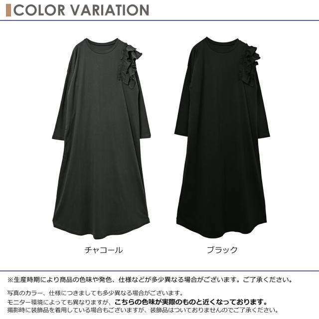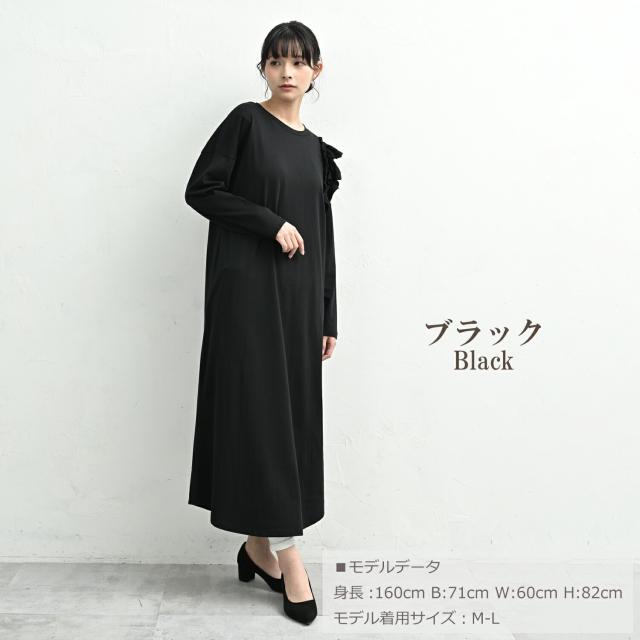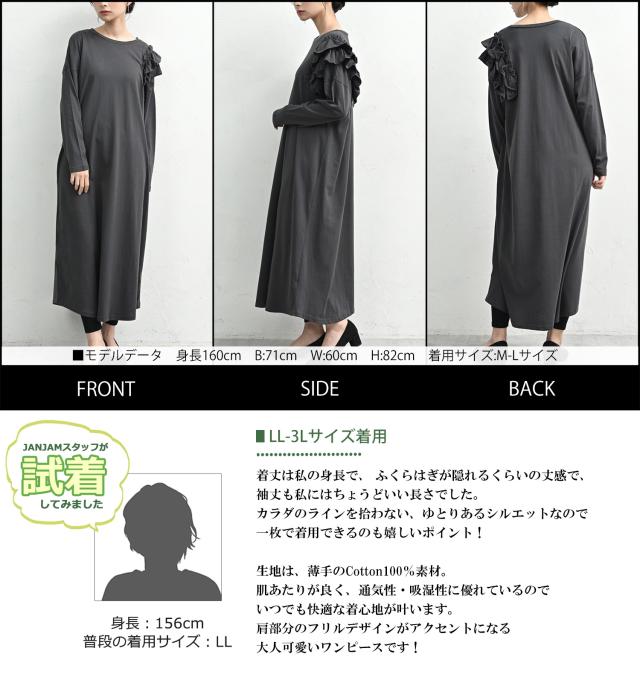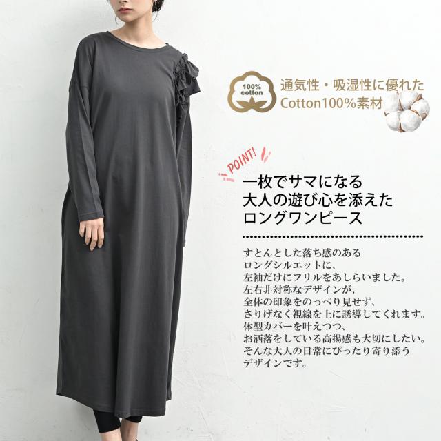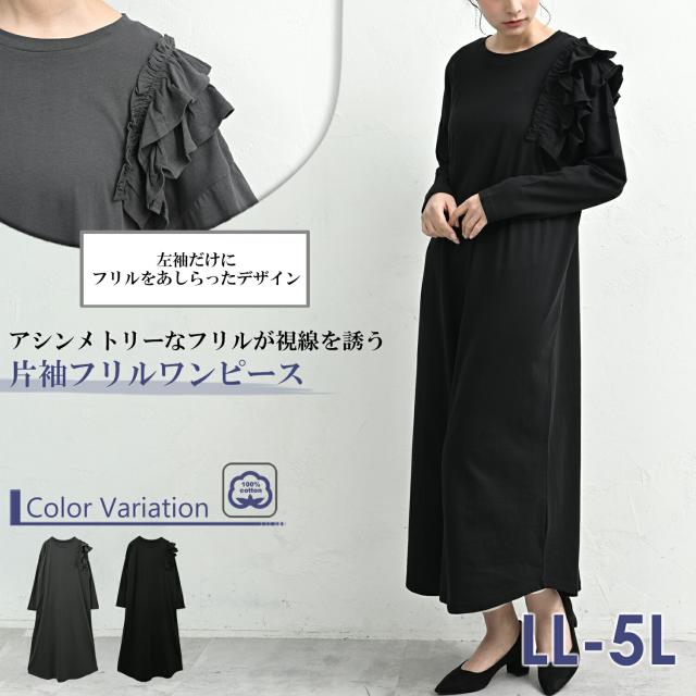 on-sa-op0375 【JANJAM2026春新作】 ワンピース 長袖ワンピース ロング丈ワンピース ロングワンピース 肩フリルワンピース 片袖フリルワンピース カットソーワンピース Tシャツワンピース ロング丈 アンクル丈 ミモレ丈 マキシ ロング Uネック クルーネック ラウンドネック 丸首 長袖 肩フリル ティアードフリル 2段フリル アシンメトリー アシメ フレア 春服 秋服 春物 秋物 春ワンピース 秋ワンピース 春ワンピ 秋ワンピ 春秋ワンピース 春秋 春夏 綿100% コットン100% 綿 cotton100 綿素材 コットン素材 コットンカットソー 洗える 洗濯機OK お手入れ簡単 お家で洗える 伸びる ストレッチ 伸縮生地 やわらかな生地 動きやすい 透けない 裏地なし 着痩せ 細見え ゆったり 大きめ 体型カバー ぽっちゃり 大人 カジュアル フェミニン ナチュラル きれいめカジュアル シンプル 上品 デイリーワンピース 大人可愛い きれいめ 綺麗め かわいい 可愛い かっこいい 着こなし おしゃれ 定番 春コーデ 秋コーデ ファッション 大きめ 女性 婦人用 ミセス 30代 40代 50代 2026 春新作 春 秋 黒 灰色 ブラック チャコール グレー LL 3L 4L 5L 2L 2XL 3XL 4XL XL XXL XXXL XXXXL 13号 15号 17号 19号