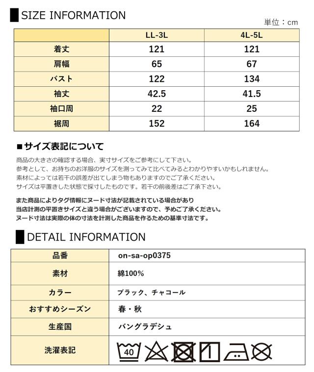 4L-5L:着丈121 肩幅67 バスト134 袖丈41.5 袖口周25 裾周164