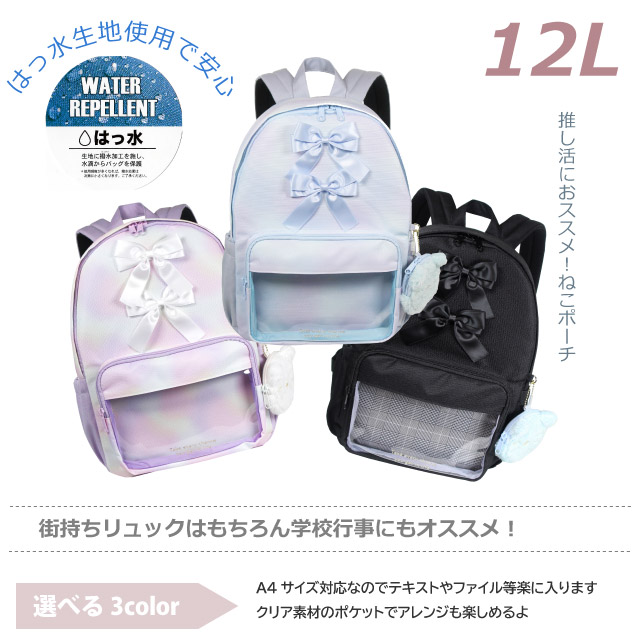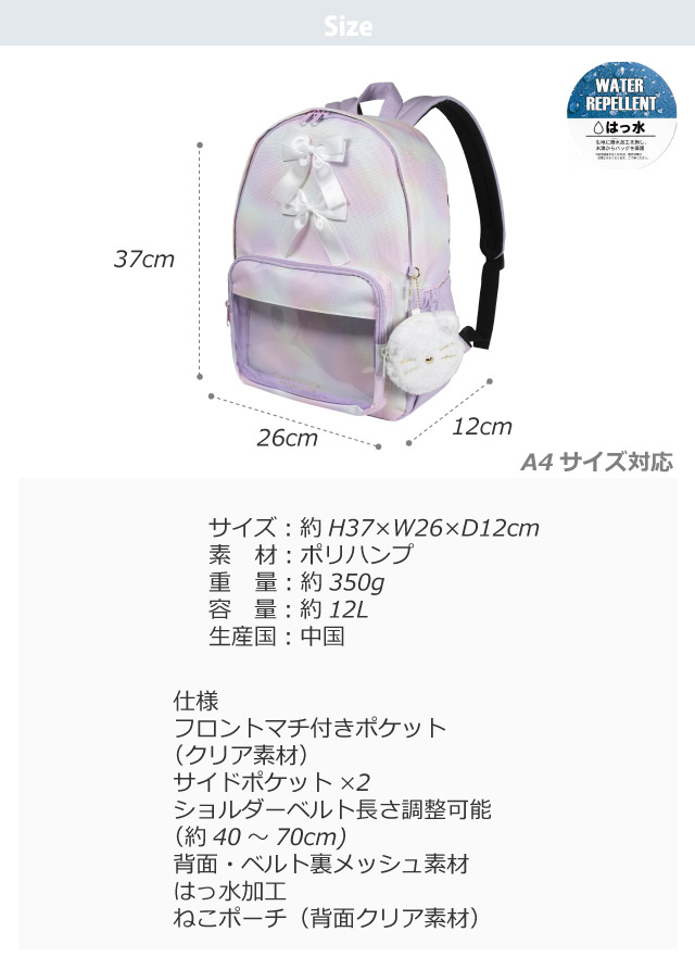 ![]() ![]() ![]() ![]() ![]() ・anilet アニレット リボンファーネコ ネコのポーチ付きでかわいいリュックサック。 小学生の女の子に人気です。 ポーチの裏面はクリア素材。推しを入れると推し活リュックになります。 A4サイズ対応で収納力も抜群。 ちょっとした雨でも安心の撥水加工生地。 修学旅行・旅行・遠足・通園・通学・お出かけにおすすめ。