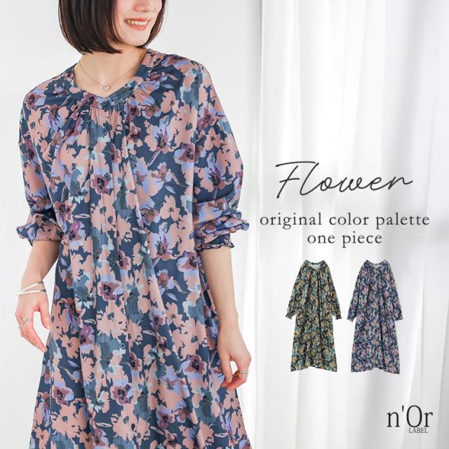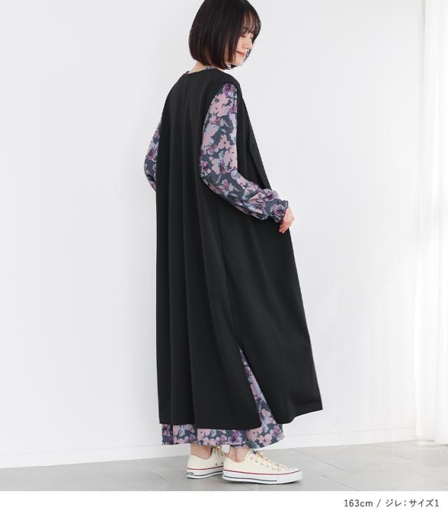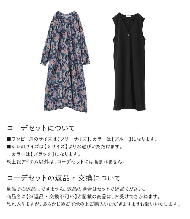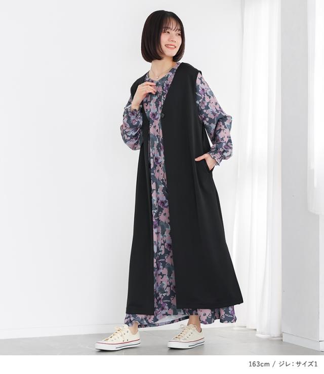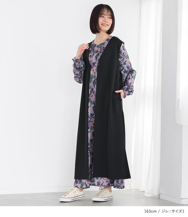 『花柄シャーリングギャザーワンピース×ロングポンチジレコーデ2点SET』【メール便不可】【50】[2点コーデセット 2026 レディース ワンピース 長袖 ドレス ロングワンピース ジレ ベスト ロング丈 ライトアウター]
