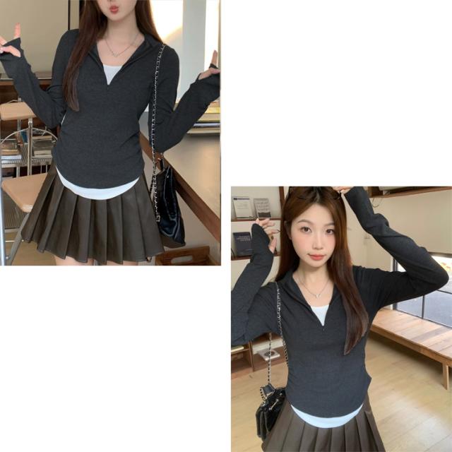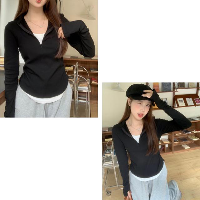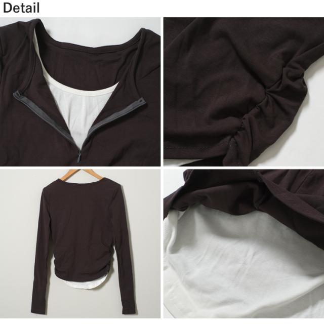 全品送料無料一部除く レイヤード風 フィンガーホール付き ハーフジップトップス ma 【即納】ロンT 長袖 ロング丈 サイドギャザー 重ね着 指穴付き 肩パット入り 配色デザイン グレー レディース 韓国 Y2Kファッション 韓国ストリート 流行り トレンド かわいい