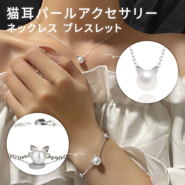★ 送料無料 ★ 猫耳パールアクセサリー(ネックレス/ブレスレット) ペンダント ジュエリー チャーム 猫耳 猫モチーフ パールアクセ 猫好きギフト ペアアクセ 誕生日プレゼント レディース ネックレス セット ネコ 猫柄 猫型 軽量 約2g
