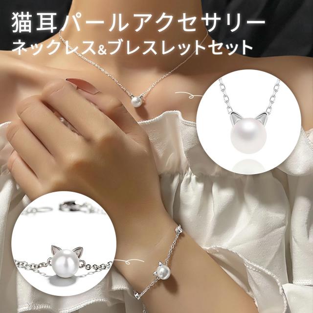 ★ 送料無料 ★ 猫耳パールアクセサリー(ネックレス&ブレスレットセット) ペンダント ジュエリー チャーム 猫耳 猫モチーフ パールアクセ 猫好きギフト ペアアクセ 誕生日プレゼント レディース ネックレス セット ネコ 猫柄 猫型 軽量 約2g