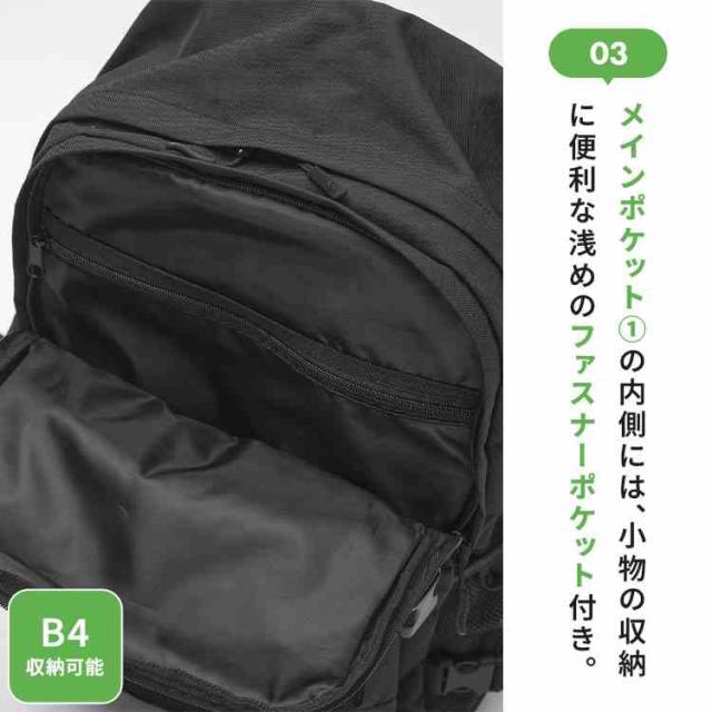 B4サイズまで対応するゆとりの収納力に、内側には15インチ程度まで収納可能なPCポケットを装備。書類やノートPCをすっきり分けて持ち運べます。さらに合計5か所のファスナーポケットを備え、小物類も整理しやすい設計です。