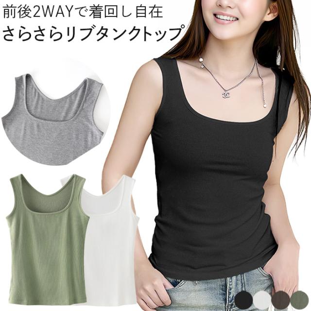タンクトップ レディース リブあみ スクエアネック Vネック 前後2WAY カップなし インナー 伸縮 ノースリーブ さらさら 無地 カジュアル 女性用 肌着 rr-075 プレゼント ギフト 母の日 父の日 敬老の日 バレンタイン ホワイトデー クリスマス