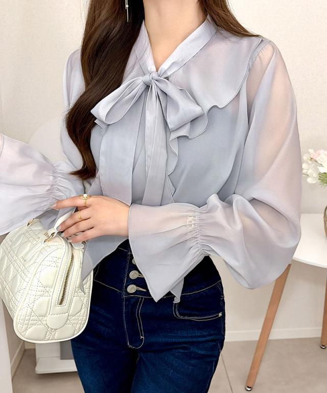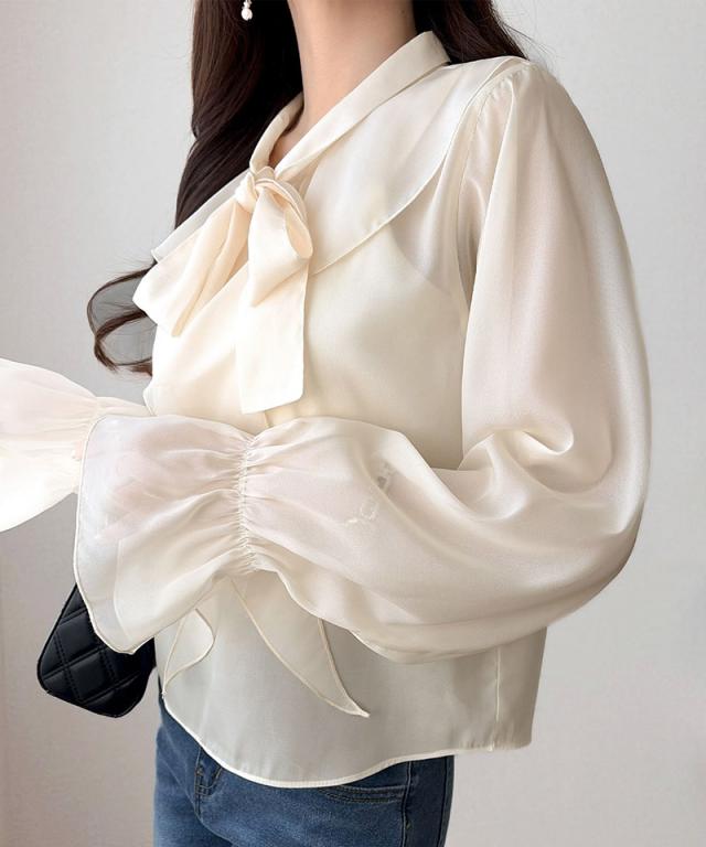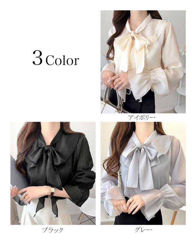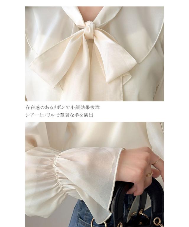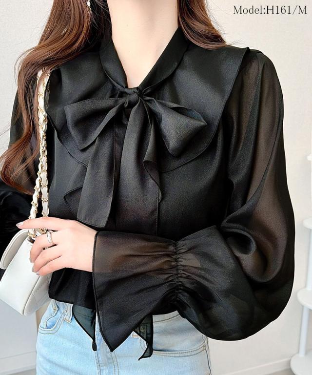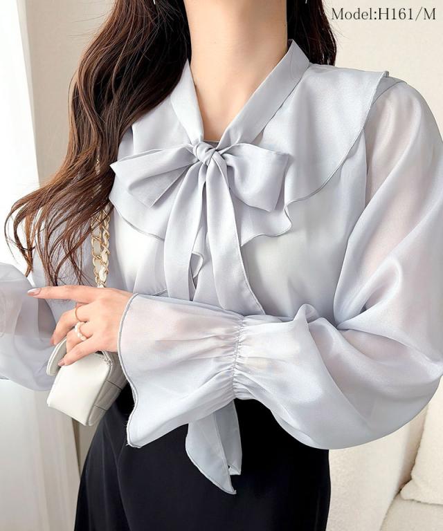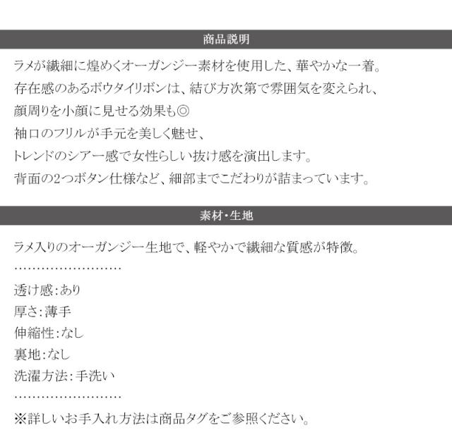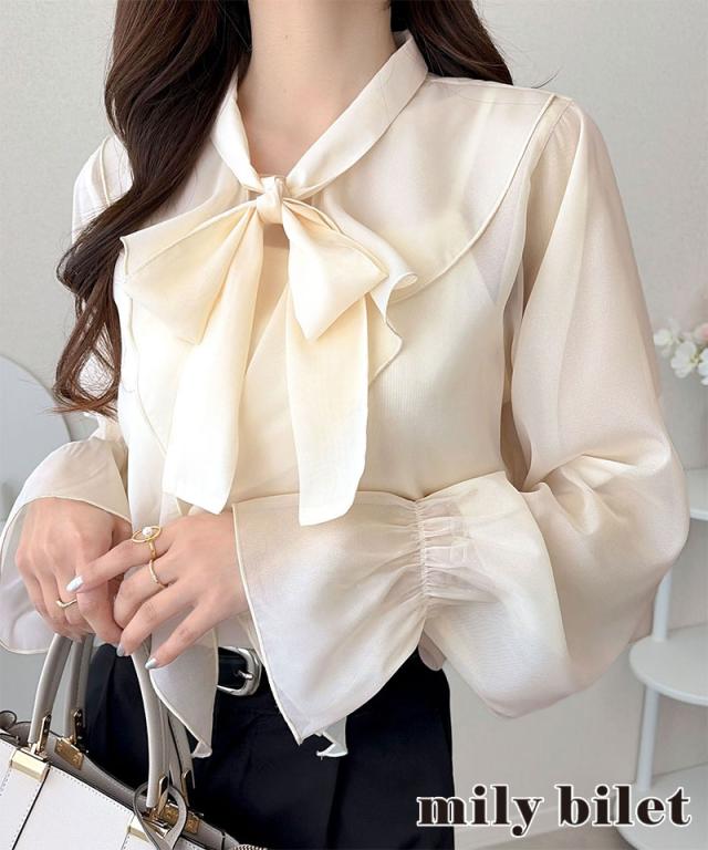 クラシカルエルフ夏新作 mily bilet トップス ブラウス レディース ボウタイリボン シャイニーシアー 上品 透け感 ラメ フリルデザイン 華やか 大人可愛い オーガンジー素材 軽やか キャンディースリーブ オンオフ 高見え 大きいサイズ 黒 白 2026ss mi1359030