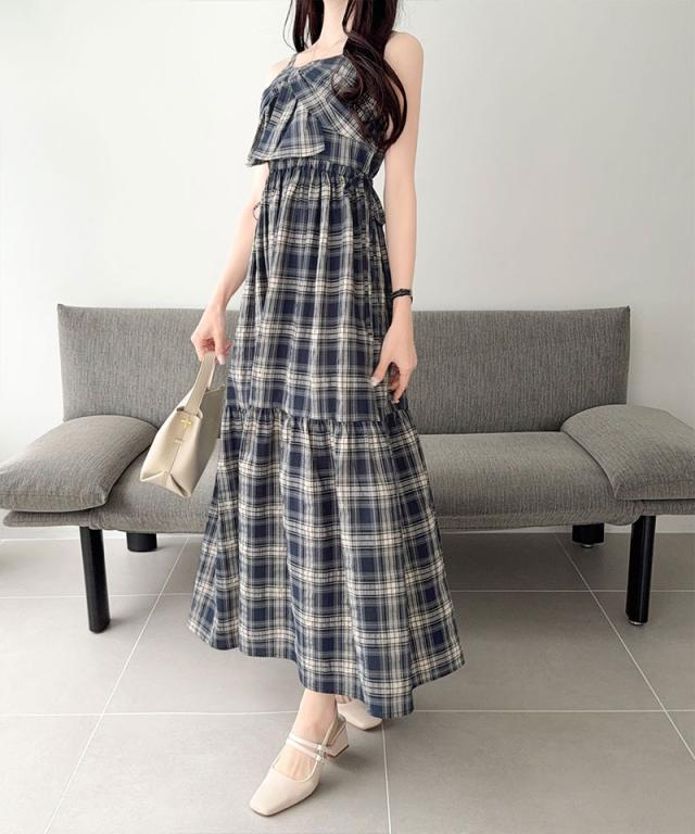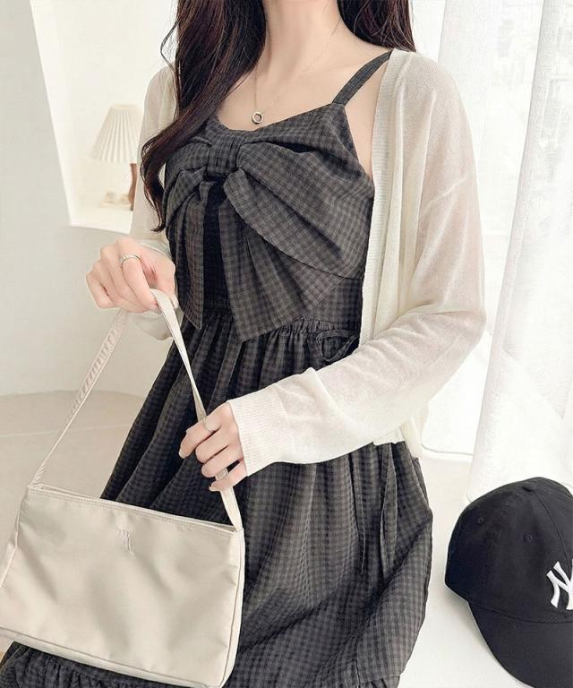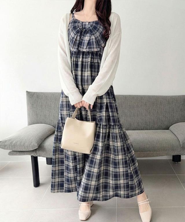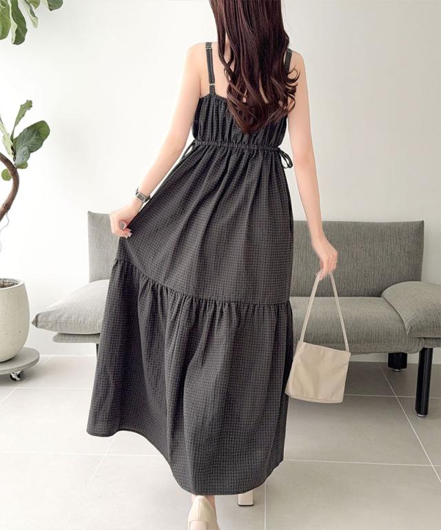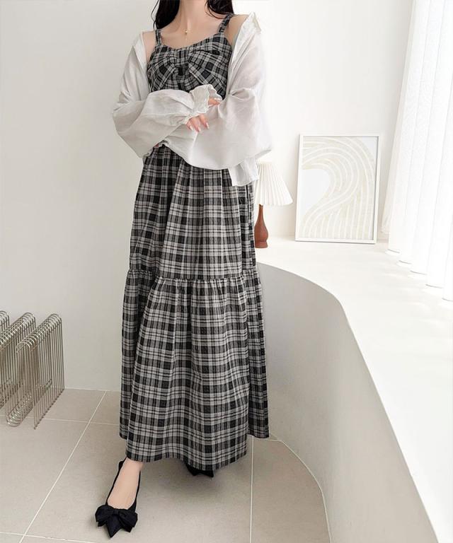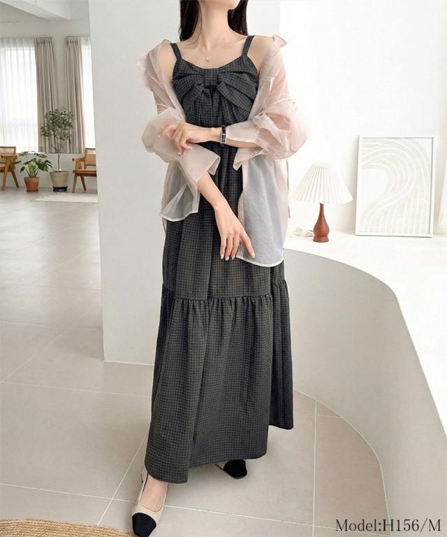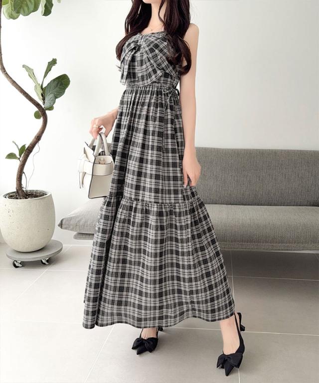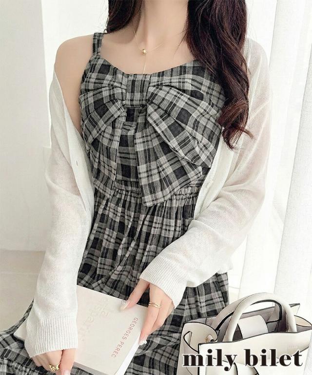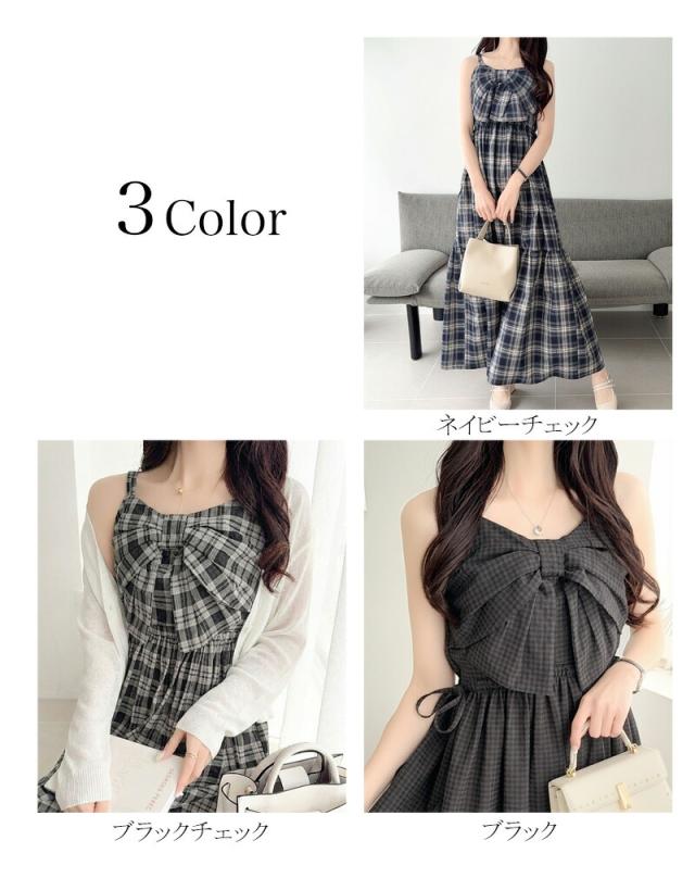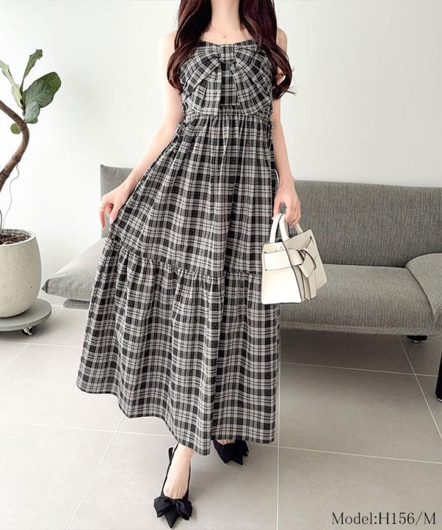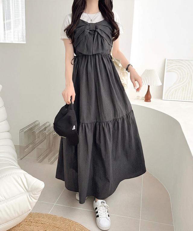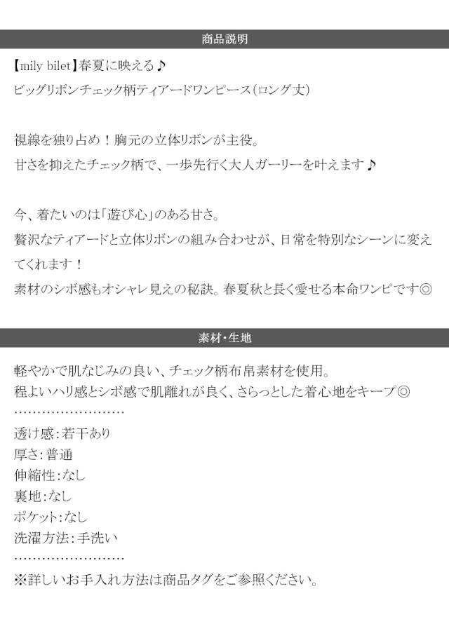 クラシカルエルフ夏新作 mily bilet ワンピース レディース ビッグリボン チェック柄 ティアード ワンピ ロング丈 ウエスト ゴム ドロスト 仕様 大きいサイズ 黒 白 2026ss mi1019121