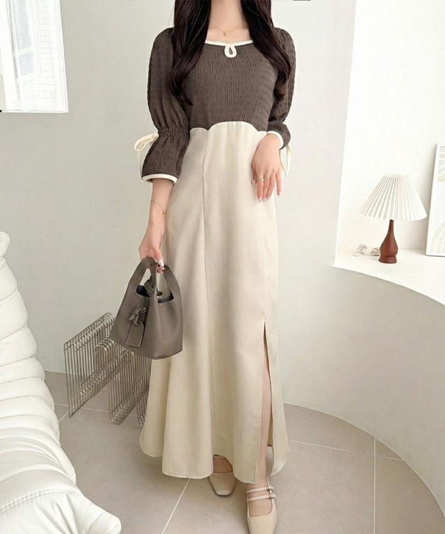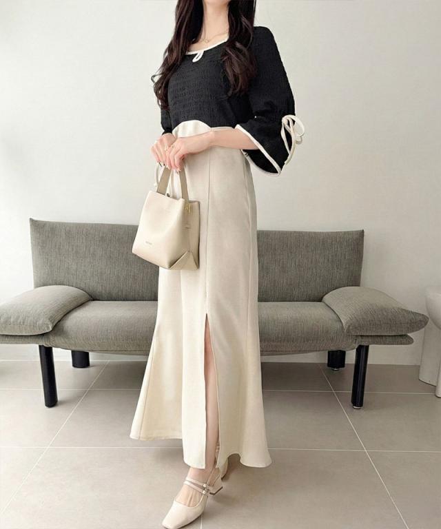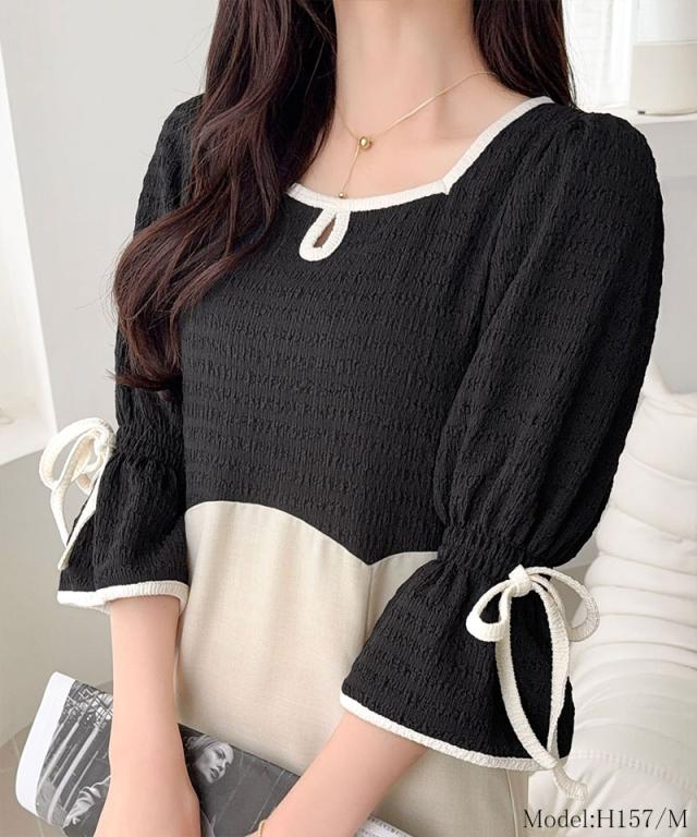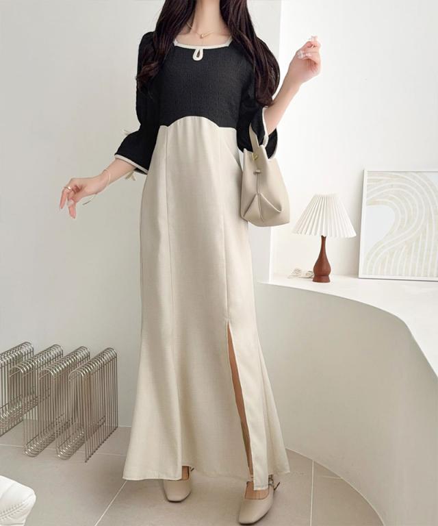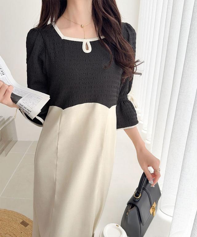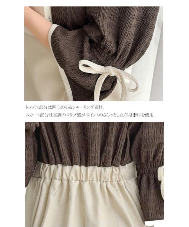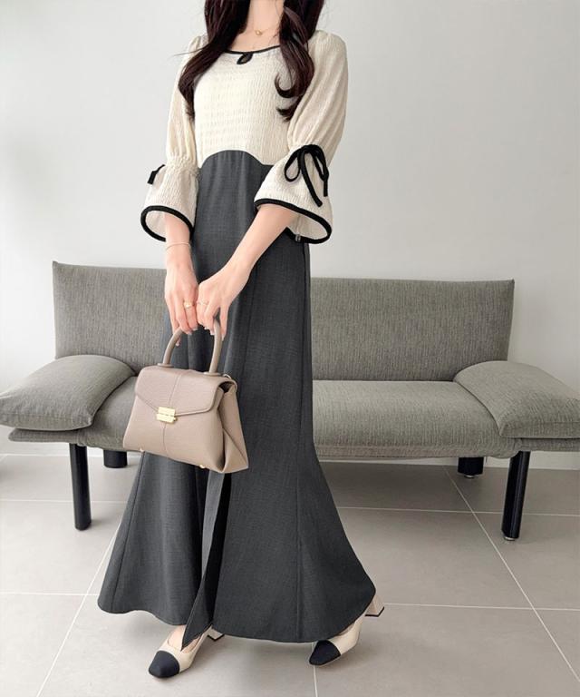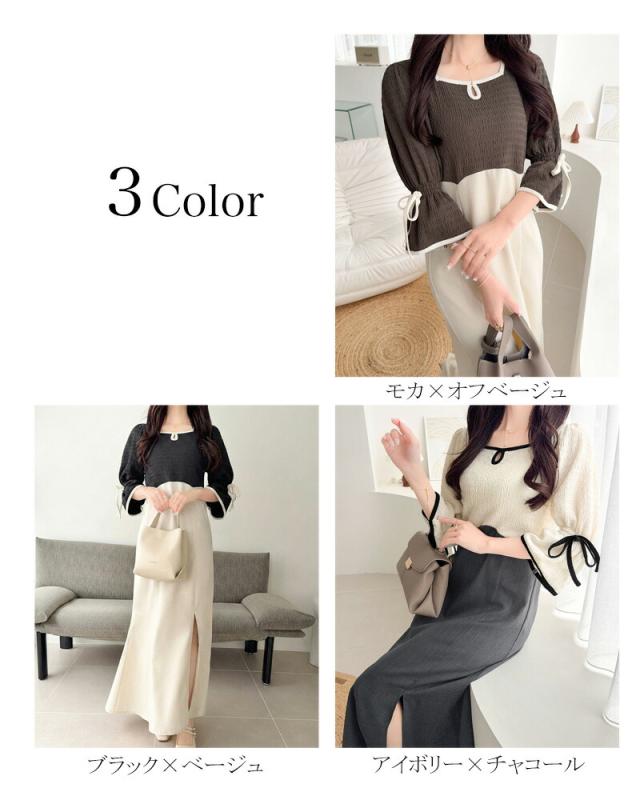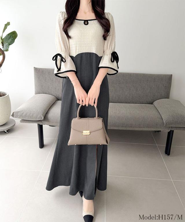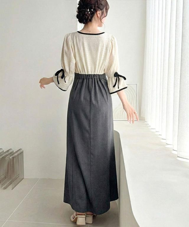 クラシカルエルフ夏新作 mily bilet ワンピース レディース 袖 リボン 付き 配色 パイピング 異素材 ドッキング ワンピ ロング丈 大きいサイズ 黒 白 2026ss mi1019133
