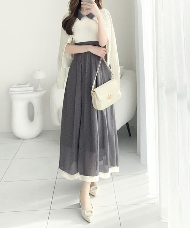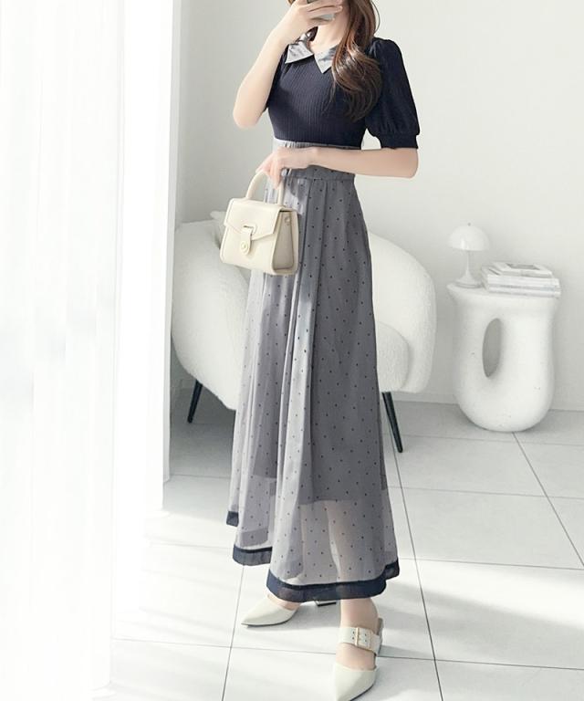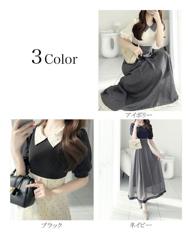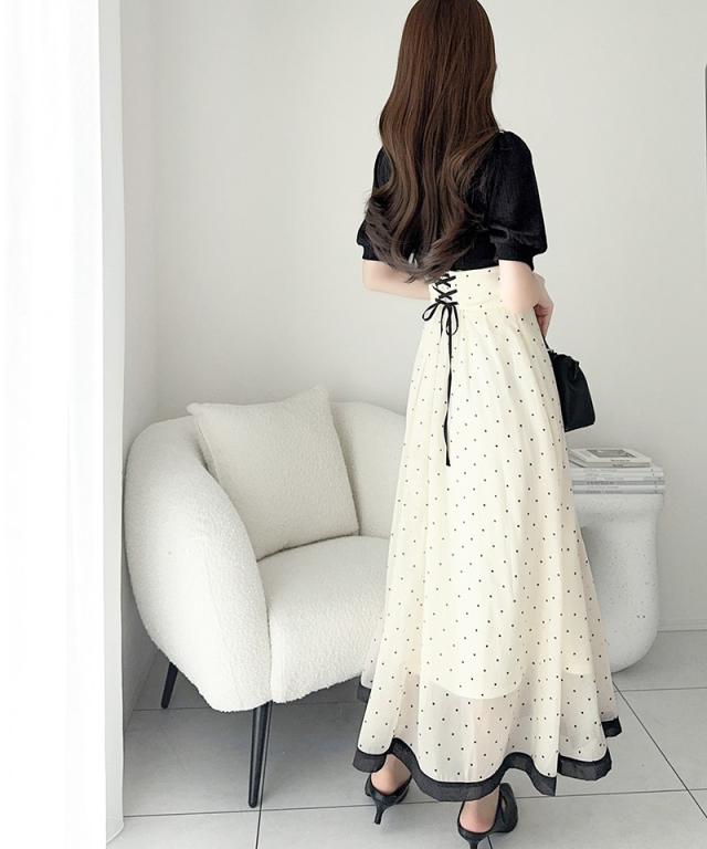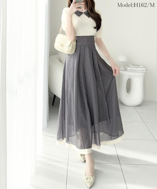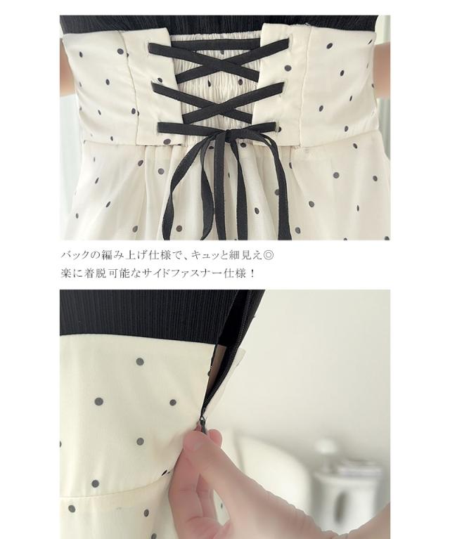 クラシカルエルフ夏新作 mily bilet ワンピース レディース 切り替え ドッキング 半袖 ドット柄 シアー 上品 ロング丈 清楚見え レトロ 編み上げ 細見え 華やか 大きいサイズ 黒 白 2026ss mi1139108