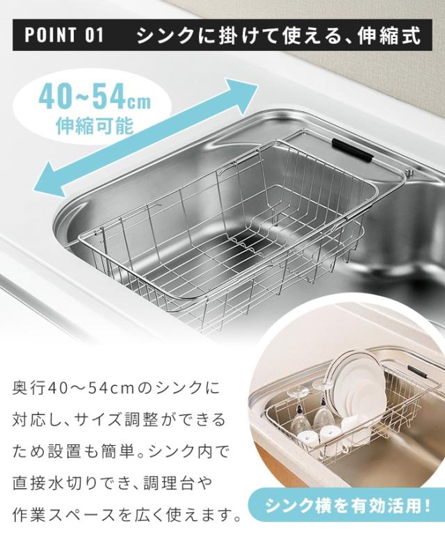 伸縮式 ステンレス 水切りかご トレー付き シンク掛け 奥行40-54cm対応 水切りラック ステンレス製 水切りバスケット シンク内対応 伸縮 省スペース コンパクト 小型 食器水切り 滑り止め付き キッチン収納 一人用 サブ使い