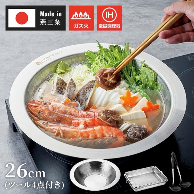 | 【燕熟の技】 ● 寄せすき鍋26cm(単品) ● 寄せすき鍋26cm&お玉・穴あきお玉付 ● 寄せすき鍋26cm・ガラス蓋付き ● 寄せすき鍋26cm・ガラス蓋付き&お玉・穴あきお玉付 ● 寄せすき鍋26cm&角バット・ザル&お玉・穴あきお玉付 ※このページは[燕熟の技 寄せすき鍋26cm&角バット・ザル&お玉・穴あきお玉付]を販売しております。 |