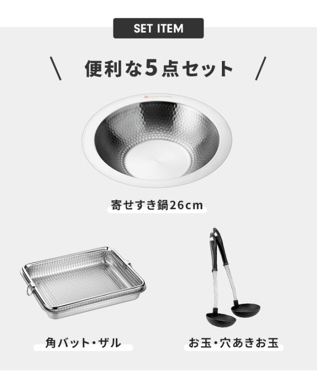 強度と美しさを兼ね備えた槌目仕上げの側面が印象的な日本製ステンレスすき焼き鍋に、お玉・穴あきお玉、さらに角バットとザルを組み合わせた実用性の高い鍋セット。