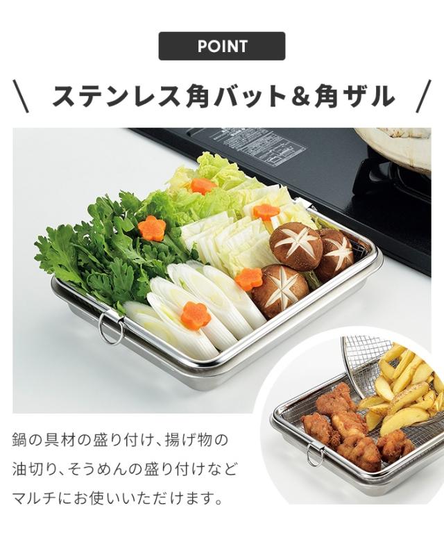 また、ステンレス製の角バットとザルは、野菜や肉の下ごしらえ、水切り、食材の一時置きなどに活躍し、鍋料理の準備を効率よく行えます。