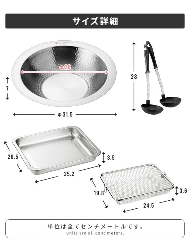 | [寄せすき鍋26cm]31.5×31.5×高さ7cm/690g [角ザル]24.5×19.8×高さ3.6cm/140g [バット]25.2×20.5×高さ3.5cm/330g [お玉]全長28cm(皿部φ8.5cm)/50g [穴あきお玉]全長28cm(皿部φ8.5cm)/50g |