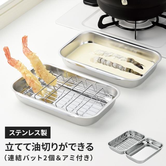 連結バット 2点セット バット 立てて油切りアミ付き ステンレスバット 油切りバット 網付き 下ごしらえ 揚げ物用 天ぷら フライ 油切り網 調理用 トレー 角バット キッチンバット ステンレス製 重ねて収納 日本製 燕三条 国産 調